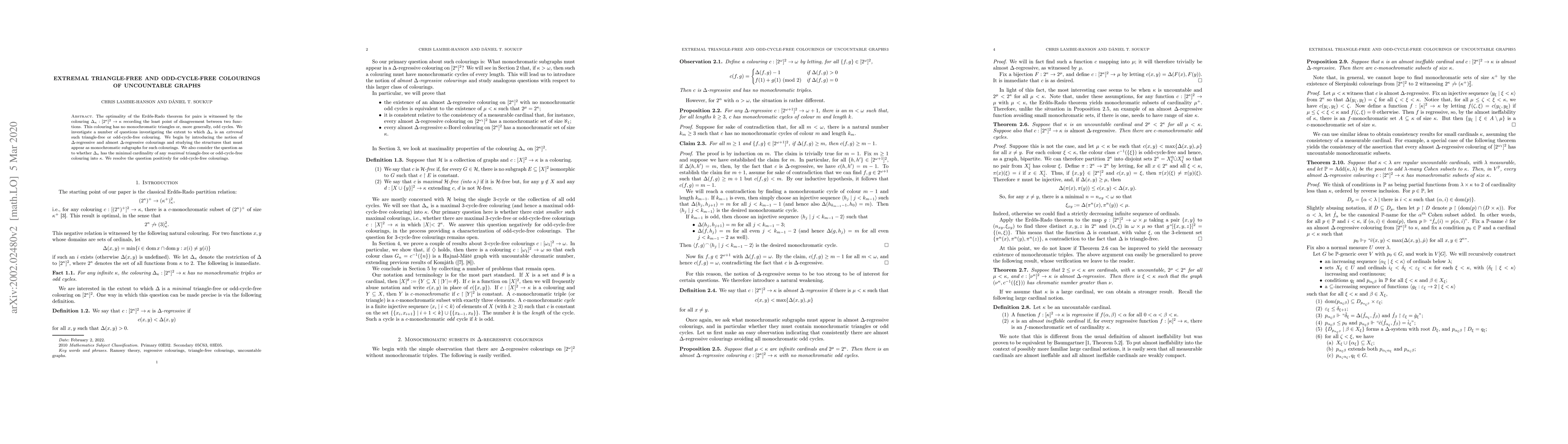 This paper explores the extremal properties of the $\Delta_\kappa$ colouring, which is triangle-free and odd-cycle-free, and investigates whether it has the minimal cardinality among maximal such colourings. The authors resolve that $\Delta_\kappa$ is indeed minimal for odd-cycle-free colourings.