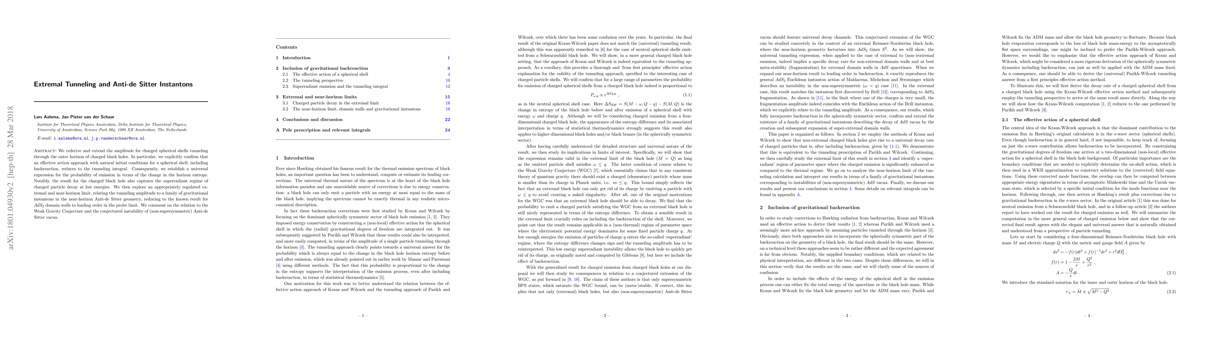 We rederive and extend the amplitude for charged spherical shells tunneling through the outer horizon of charged black holes. In particular, we explicitly confirm that an effective action approach with natural initial conditions for a spherical shell, including backreaction, reduces to the tunneling integral. Consequently, we establish a universal expression for the probability of emission in terms of the change in the horizon entropy. Notably, the result for the charged black hole also captures the superradiant regime of charged particle decay at low energies. We then explore an appropriately regulated extremal and near-horizon limit, relating the tunneling amplitude to a family of gravitational instantons in the near-horizon Anti-de Sitter geometry, reducing to the known result for $AdS_2$ domain walls to leading order in the probe limit. We comment on the relation to the Weak Gravity Conjecture and the conjectured instability of (non-supersymmetric) Anti-de Sitter vacua.