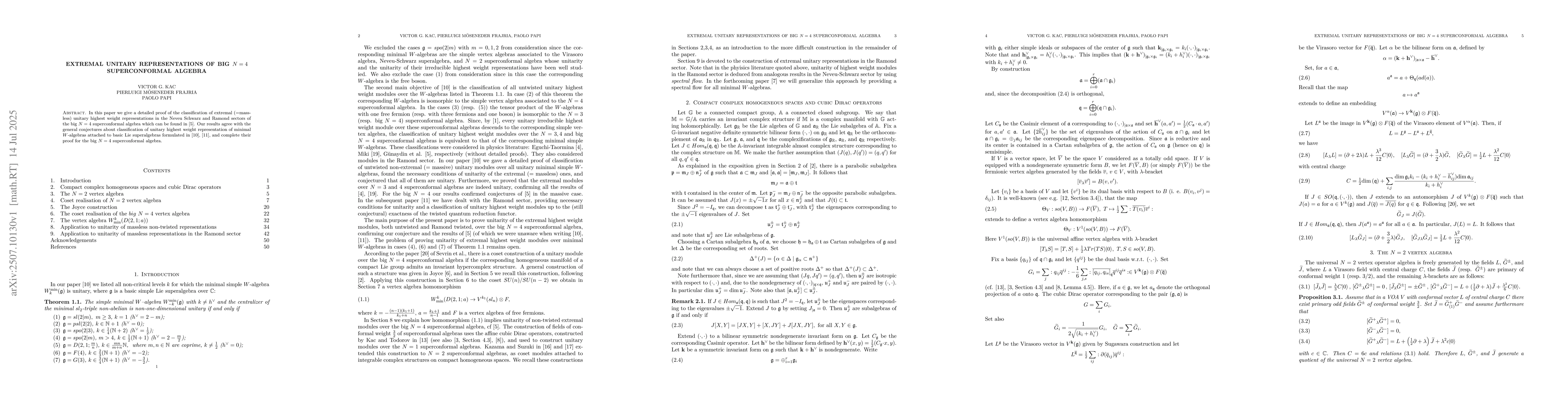 In this paper we give a detailed proof of the classification of extremal (=massless) unitary highest weight representations in the Neveu Schwarz and Ramond sectors of the big $N=4$ superconformal algebra which can be found in [5]. Our results agree with the general conjectures about classification of unitary highest weight representation of minimal $W$-algebras attached to basic Lie superalgebras formulated in [10], [11], and complete their proof for the big $N=4$ superconformal algebra.