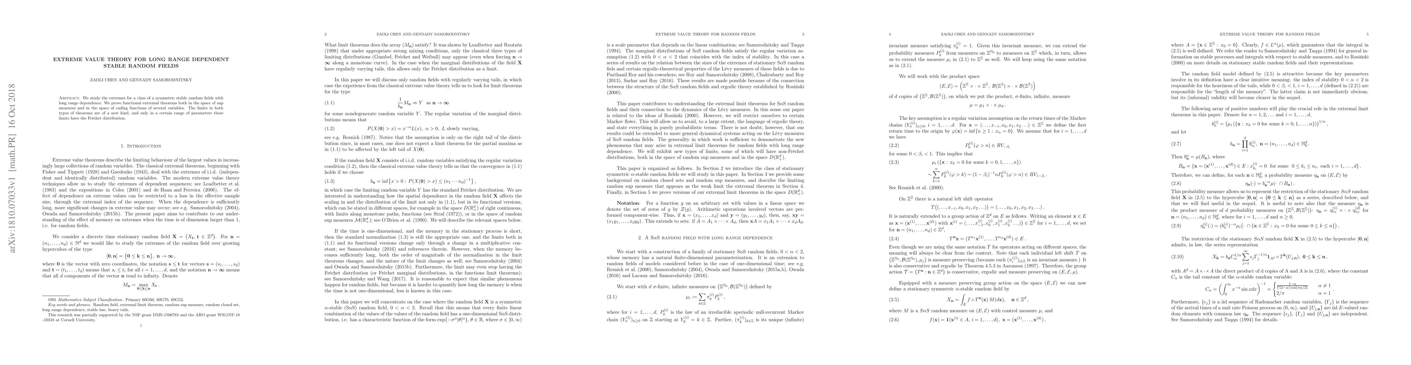 We study the extremes for a class of a symmetric stable random fields with long range dependence. We prove functional extremal theorems both in the space of sup measures and in the space of cadlag functions of several variables. The limits in both types of theorems are of a new kind, and only in a certain range of parameters these limits have the Fr\'{e}chet distribution.