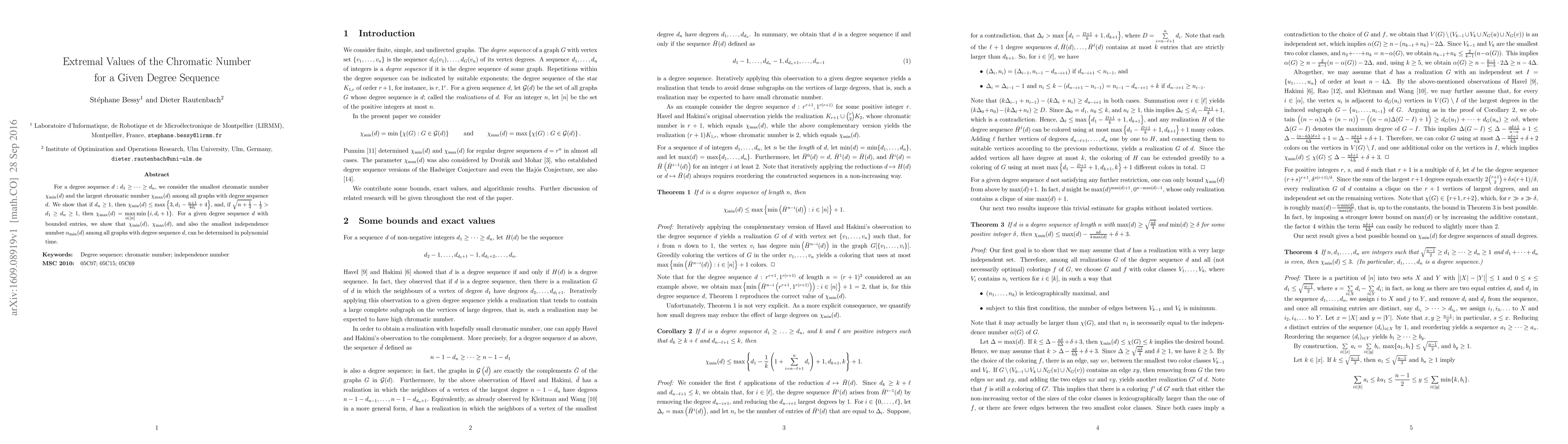 For a degree sequence $d:d_1\geq \cdots \geq d_n$, we consider the smallest chromatic number $\chi_{\min}(d)$ and the largest chromatic number $\chi_{\max}(d)$ among all graphs with degree sequence $d$. We show that if $d_n\geq 1$, then $\chi_{\min}(d)\leq \max\left\{ 3,d_1-\frac{n+1}{4d_1}+4\right\}$, and, if $\sqrt{n+\frac{1}{4}}-\frac{1}{2}>d_1\geq d_n\geq 1$, then $\chi_{\max}(d)=\max\limits_{i\in [n]}\min\left\{ i,d_i+1\right\}$. For a given degree sequence $d$ with bounded entries, we show that $\chi_{\min}(d)$, $\chi_{\max}(d)$, and also the smallest independence number $\alpha_{\min}(d)$ among all graphs with degree sequence $d$, can be determined in polynomial time.