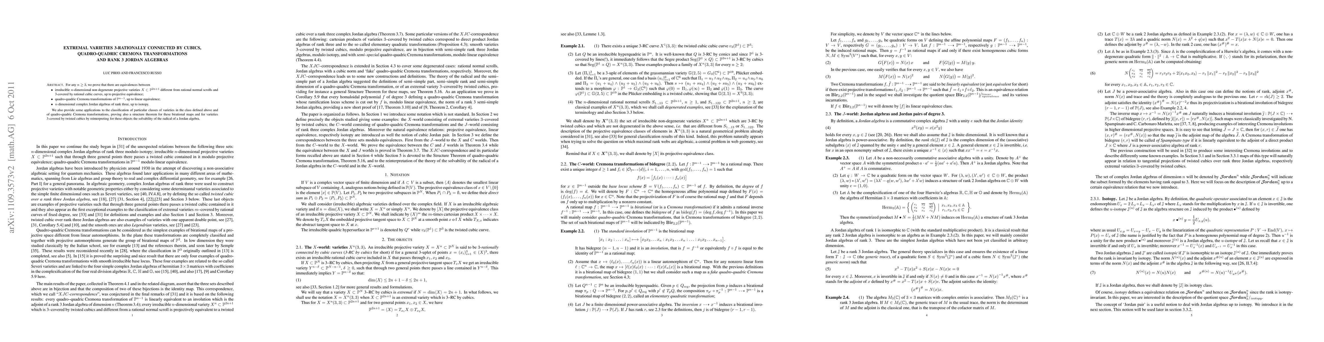 For any $n\geq 3$, we prove that there exist equivalences between these apparently unrelated objects: irreducible $n$-dimensional non degenerate projective varieties $X\subset \mathbb P^{2n+1}$ different from rational normal scrolls and 3-covered by twisted cubic curves, up to projective equivalence; quadro-quadric Cremona transformations of $ \mathbb P^{n-1}$, up to linear equivalence; $n$-dimensional complex Jordan algebras of rank three, up to isotopy. We also provide some applications to the classification of particular classes of varieties in the class defined above and of quadro-quadric Cremona transformations, proving also a structure theorem for these birational maps and for varieties 3-covered by twisted cubics by reinterpreting for these objects the solvability of the radical of a Jordan algebra.