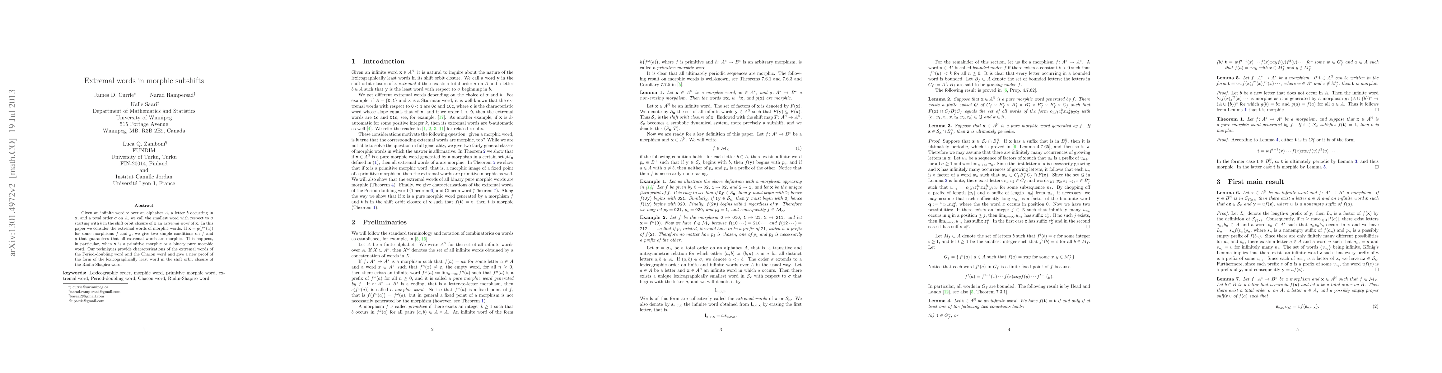 This paper explores extremal words in morphic subshifts, providing conditions under which all extremal words are morphic. It characterizes extremal words for specific morphic words, including the Period-doubling word, Chacon word, and Rudin-Shapiro word.