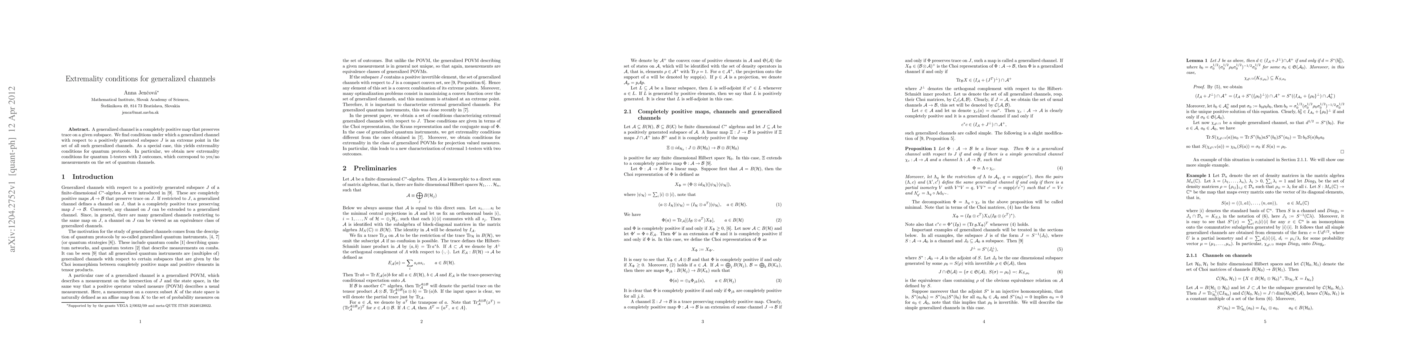 A generalized channel is a completely positive map that preserves trace on a given subspace. We find conditions under which a generalized channel with respect to a positively generated subspace J is an extreme point in the set of all such generalized channels. As a special case, this yields extremality conditions for quantum protocols. In particular, we obtain new extremality conditions for quantum 1-testers with 2 outcomes, which correspond to yes/no measurements on the set of quantum channels.