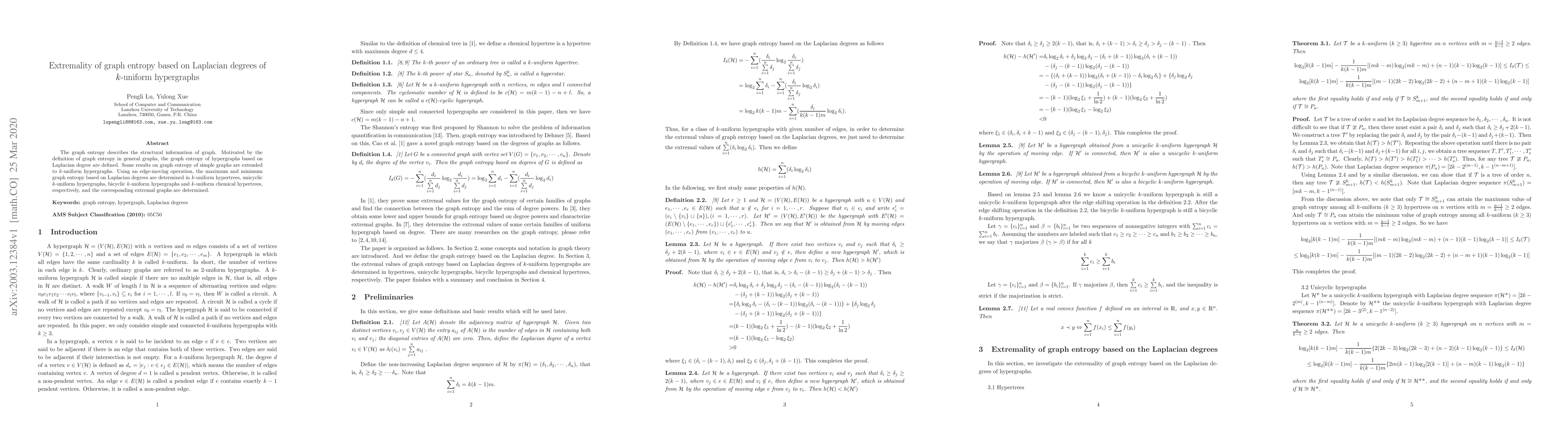 This paper defines graph entropy for k-uniform hypergraphs based on Laplacian degrees and extends results from simple graphs. It determines the maximum and minimum graph entropy for specific types of k-uniform hypergraphs using an edge-moving operation and identifies the corresponding extremal graphs.