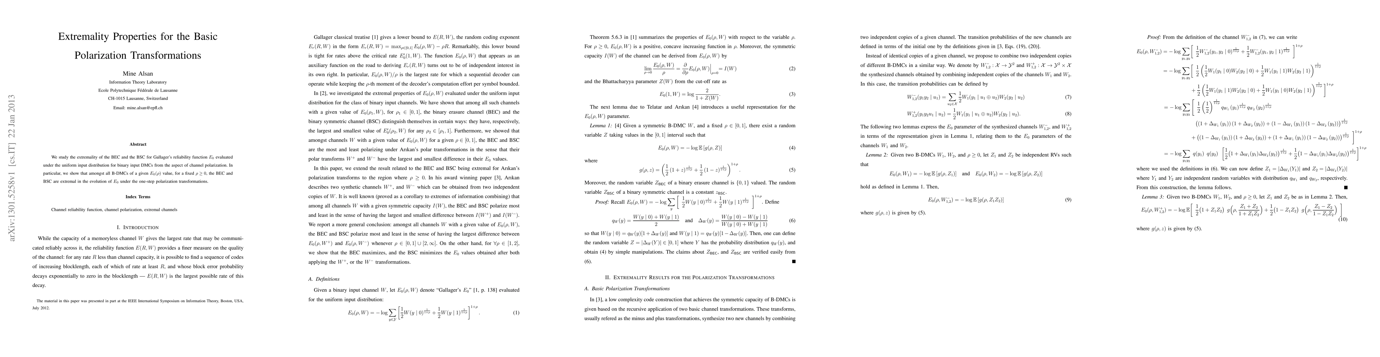 We study the extremality of the BEC and the BSC for Gallager's reliability function $E_0$ evaluated under the uniform input distribution for binary input DMCs from the aspect of channel polarization. In particular, we show that amongst all B-DMCs of a given $E_0(\rho)$ value, for a fixed $\rho \geq 0$, the BEC and BSC are extremal in the evolution of $E_0$ under the one-step polarization transformations.