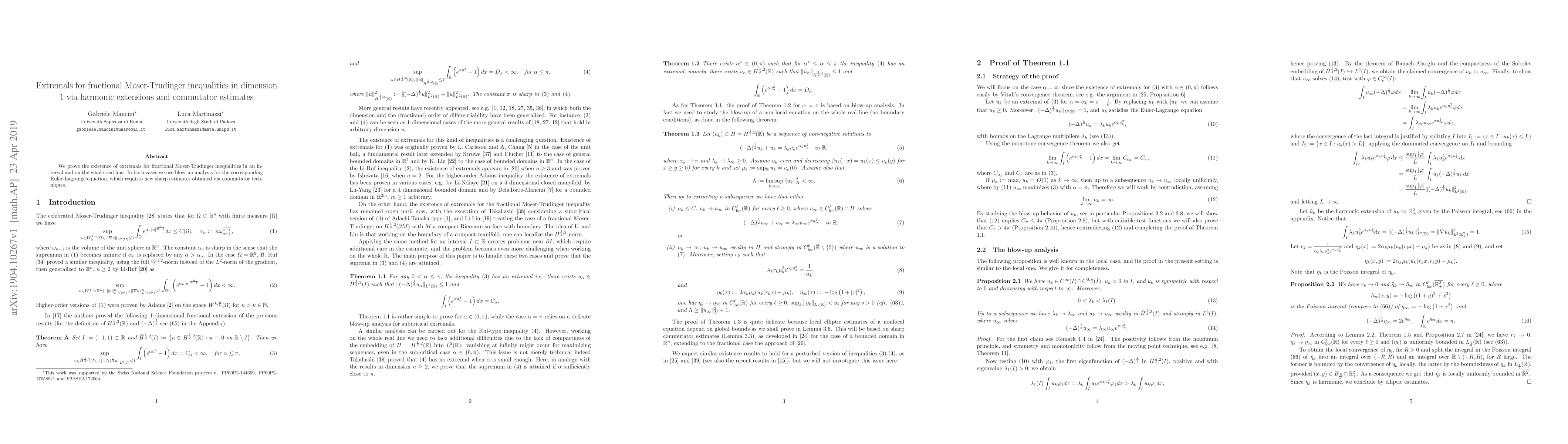 Summary: This paper establishes the existence of extremals for fractional Moser-Trudinger inequalities in dimension 1, utilizing blow-up analysis and new sharp commutator estimates to solve the corresponding Euler-Lagrange equation.