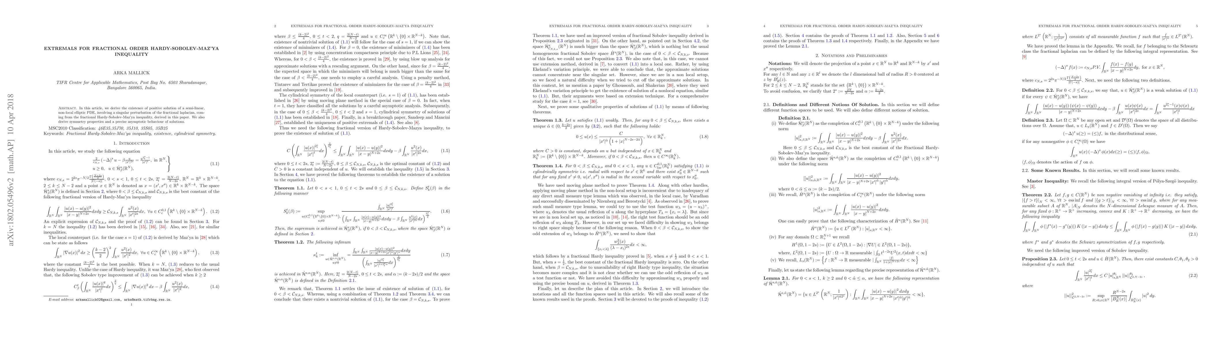 In this article, we derive the existence of positive solutions of a semi-linear, non-local elliptic PDE, involving a singular perturbation of the fractional laplacian, coming from the fractional Hardy-Sobolev-Maz'ya inequality, derived in this paper. We also derive symmetry properties and a precise asymptotic behaviour of solutions.
