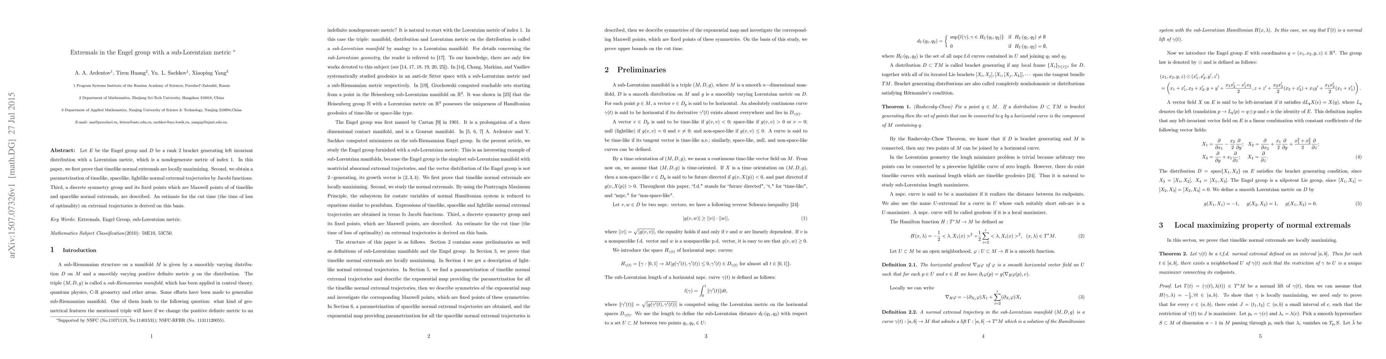 Let E be the Engel group and D be a rank 2 bracket generating left invariant distribution with a Lorentzian metric, which is a nondegenerate metric of index 1. In this paper, we first prove that timelike normal extremals are locally maximizing. Second, we obtain a parametrization of timelike, spacelike, lightlike normal extremal trajectories by Jacobi functions. Third, a discrete symmetry group and its fixed points which are Maxwell points of of timelike and spacelike normal extremals, are described. An estimate for the cut time (the time of loss of optimality) on extremal trajectories is derived on this basis.