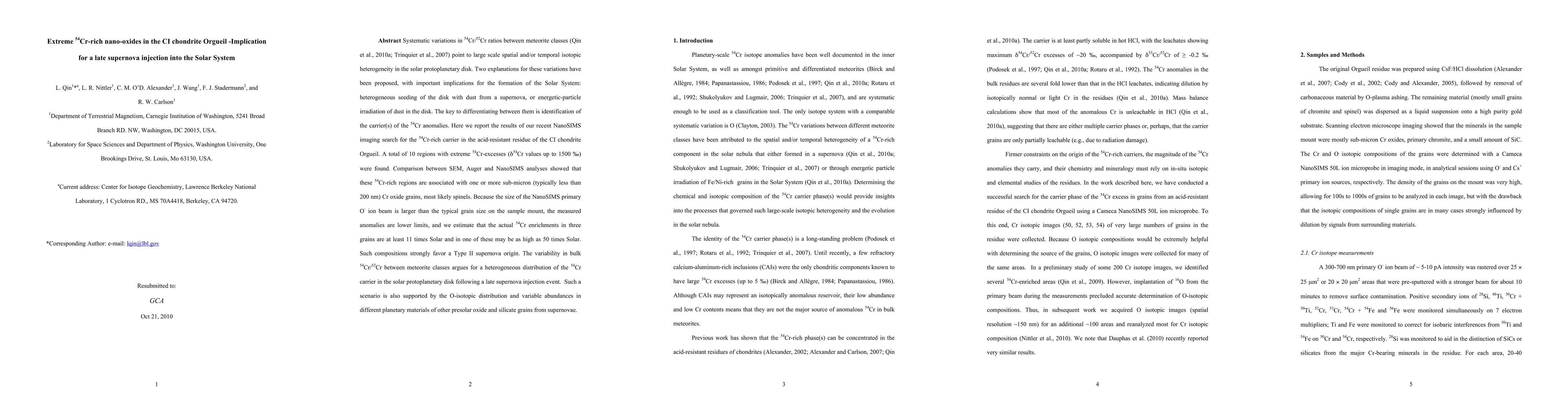 Research finds extreme 54Cr-rich nano-oxides in the CI chondrite Orgueil, supporting a late supernova origin for these anomalies and suggesting heterogeneous seeding of the solar protoplanetary disk.