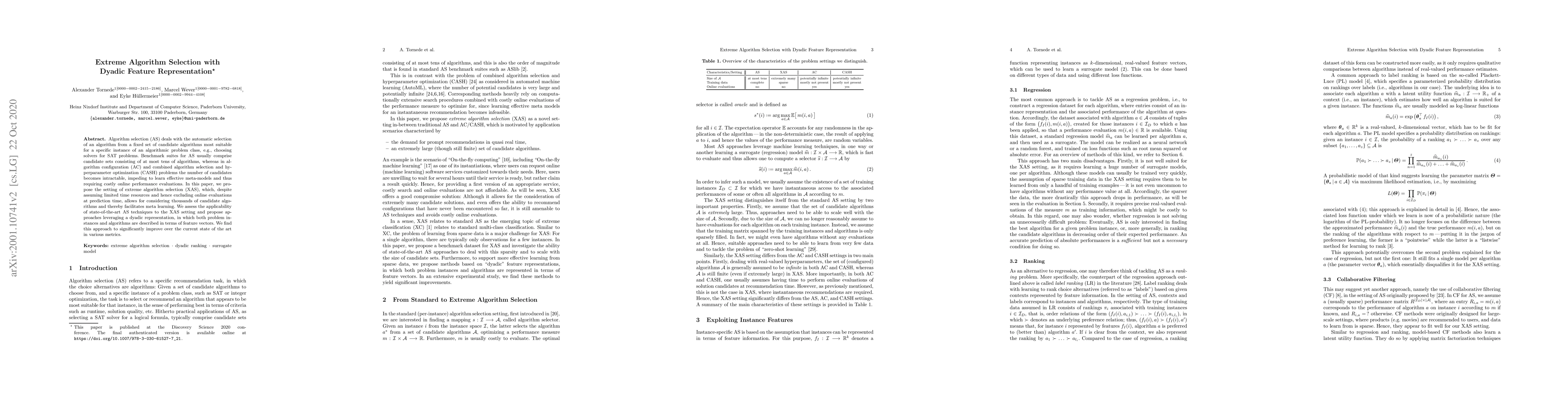 Algorithm selection (AS) deals with selecting an algorithm from a fixed set of candidate algorithms most suitable for a specific instance of an algorithmic problem, e.g., choosing solvers for SAT problems. Benchmark suites for AS usually comprise candidate sets consisting of at most tens of algorithms, whereas in combined algorithm selection and hyperparameter optimization problems the number of candidates becomes intractable, impeding to learn effective meta-models and thus requiring costly online performance evaluations. Therefore, here we propose the setting of extreme algorithm selection (XAS) where we consider fixed sets of thousands of candidate algorithms, facilitating meta learning. We assess the applicability of state-of-the-art AS techniques to the XAS setting and propose approaches leveraging a dyadic feature representation in which both problem instances and algorithms are described. We find the latter to improve significantly over the current state of the art in various metrics.