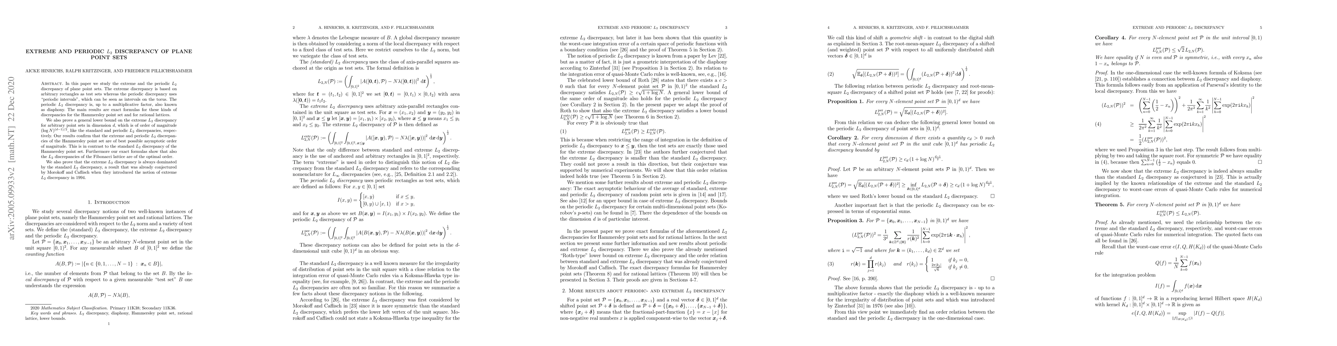This paper investigates extreme and periodic $L_2$ discrepancies of plane point sets, deriving exact formulas for the Hammersley point set and rational lattices. It confirms the optimal asymptotic order of these discrepancies and provides a general lower bound for extreme $L_2$ discrepancy in higher dimensions.