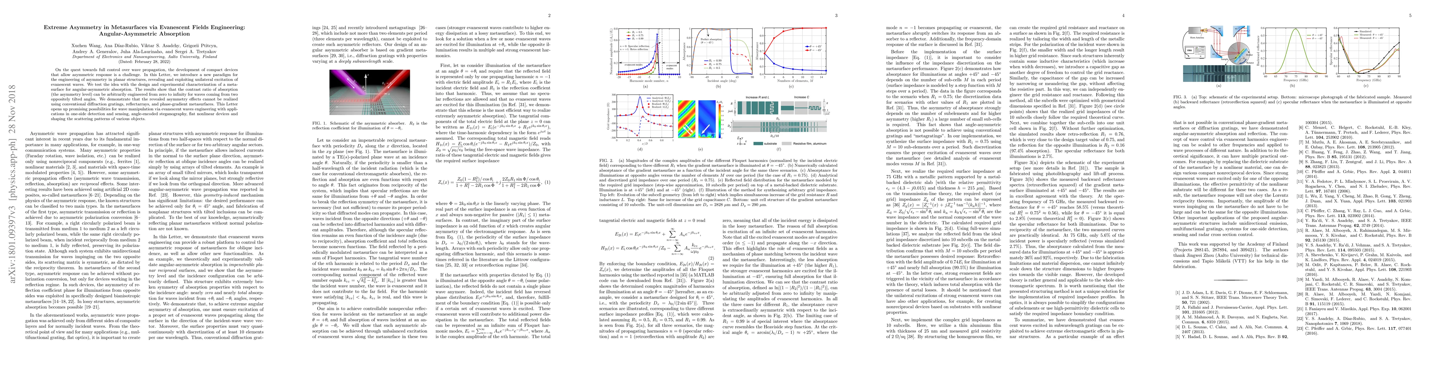 On the quest towards full control over wave propagation, the development of compact devices that allow asymmetric response is a challenge. In this Letter, we introduce a new paradigm for the engineering of asymmetry in planar structures, revealing and exploiting unilateral excitation of evanescent waves. We test the idea with the design and experimental characterization of a metasurface for angular-asymmetric absorption. The results show that the contrast ratio of absorption (the asymmetry level) can be arbitrarily engineered from zero to infinity for waves coming from two oppositely tilted angles. We demonstrate that the revealed asymmetry effects cannot be realized using conventional diffraction gratings, reflectarrays, and phase-gradient metasurfaces. This Letter opens up promising possibilities for wave manipulation via evanescent waves engineering with applications in one-side detection and sensing, angle-encoded steganography, flat nonlinear devices and shaping the scattering patterns of various objects.
