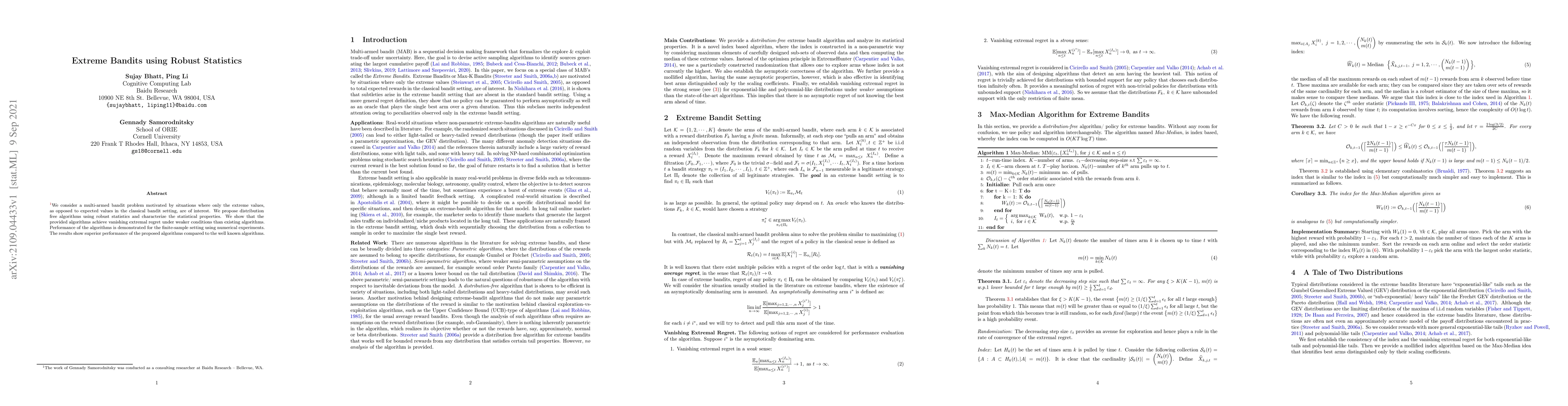 The paper proposes distribution-free algorithms for the extreme bandit problem using robust statistics, characterizing their statistical properties and showing they achieve vanishing extremal regret under weaker conditions than existing algorithms.