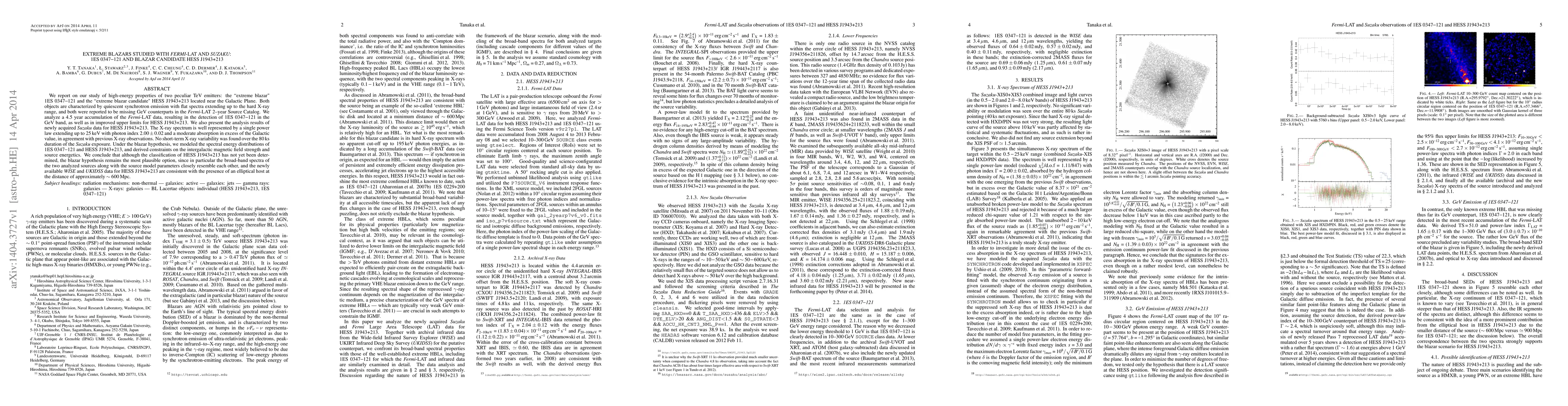 We report on our study of high-energy properties of two peculiar TeV emitters: the "extreme blazar" 1ES 0347-121 and the "extreme blazar candidate" HESS J1943+213 located near the Galactic Plane. Both objects are characterized by quiescent synchrotron emission with flat spectra extending up to the hard X-ray range, and both were reported to be missing GeV counterparts in the Fermi-LAT 2-year Source Catalog. We analyze a 4.5 year accumulation of the Fermi-LAT data, resulting in the detection of 1ES 0347-121 in the GeV band, as well as in improved upper limits for HESS J1943+213. We also present the analysis results of newly acquired Suzaku data for HESS J1943+213. The X-ray spectrum is well represented by a single power law extending up to 25 keV with photon index 2.00+/-0.02 and a moderate absorption in excess of the Galactic value, in agreement with previous X-ray observations. No short-term X-ray variability was found over the 80 ks duration of the Suzaku exposure. Under the blazar hypothesis, we modeled the spectral energy distributions of 1ES 0347-121 and HESS J1943+213, and derived constraints on the intergalactic magnetic field strength and source energetics. We conclude that although the classification of HESS J1943+213 has not yet been determined, the blazar hypothesis remains the most plausible option, since in particular the broad-band spectra of the two analyzed sources along with the source model parameters closely resemble each other, and the newly available WISE and UKIDSS data for HESS J1943+213 are consistent with the presence of an elliptical host at the distance of approximately ~600 Mpc.