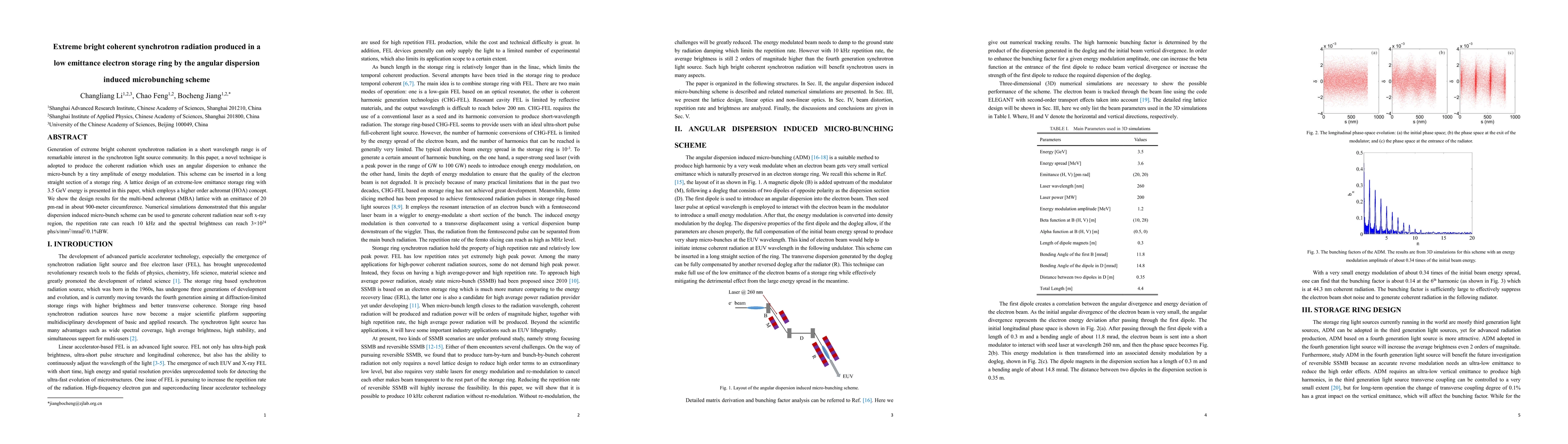Generation of extreme bright coherent synchrotron radiation in a short wavelength range is of remarkable interest in the synchrotron light source community. In this paper, a novel technique is adopted to produce the coherent radiation which uses an angular dispersion to enhance the micro-bunch by a tiny amplitude of energy modulation. This scheme can be inserted in a long straight section of a storage ring. A lattice design of an extreme-low emittance storage ring with 3.5 GeV energy is presented in this paper, which employs a higher order achromat (HOA) concept. We show the design results for the multi-bend achromat (MBA) lattice with an emittance of 20 pm-rad in about 900-meter circumference. Numerical simulations demonstrated that this angular dispersion induced micro-bunch scheme can be used to generate coherent radiation near soft x-ray region, the repetition rate can reach 10 kHz and the spectral brightness can reach 3*10^24phs/s/mm^2/mrad^2/0.1%BW.