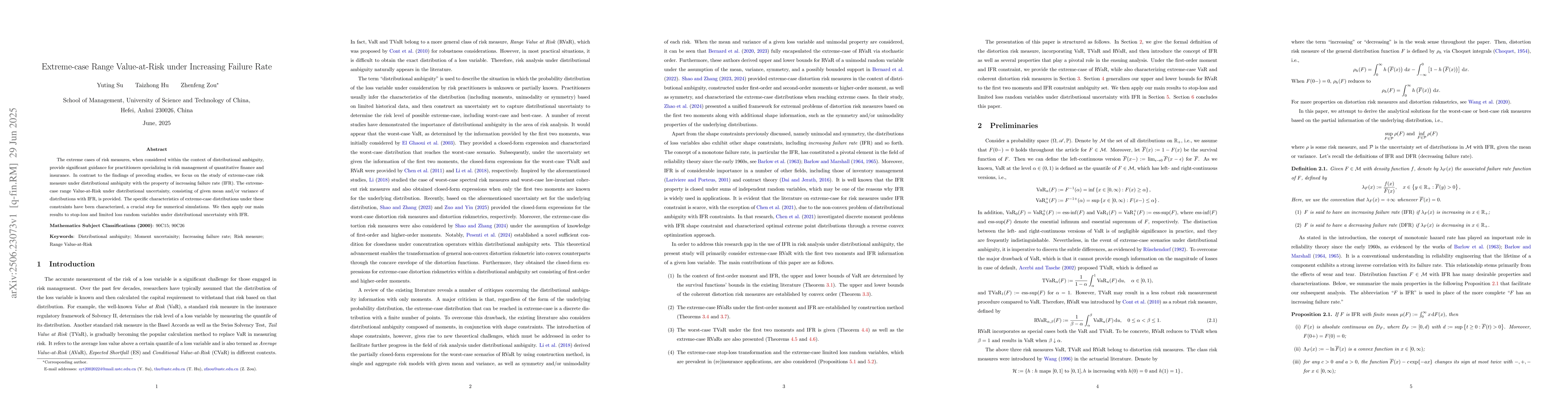The extreme cases of risk measures, when considered within the context of distributional ambiguity, provide significant guidance for practitioners specializing in risk management of quantitative finance and insurance. In contrast to the findings of preceding studies, we focus on the study of extreme-case risk measure under distributional ambiguity with the property of increasing failure rate (IFR). The extreme-case range Value-at-Risk under distributional uncertainty, consisting of given mean and/or variance of distributions with IFR, is provided. The specific characteristics of extreme-case distributions under these constraints have been characterized, a crucial step for numerical simulations. We then apply our main results to stop-loss and limited loss random variables under distributional uncertainty with IFR.