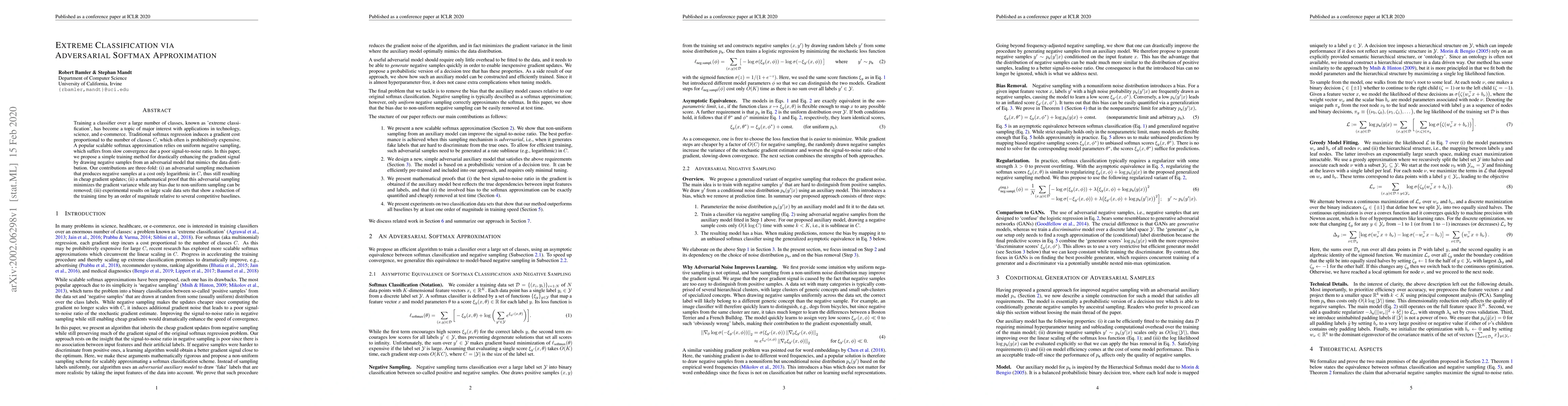 This paper proposes an adversarial softmax approximation method to enhance the gradient signal for extreme classification, reducing training time significantly. The adversarial sampling mechanism produces negative samples at a logarithmic cost relative to the number of classes, minimizing gradient variance and improving convergence.