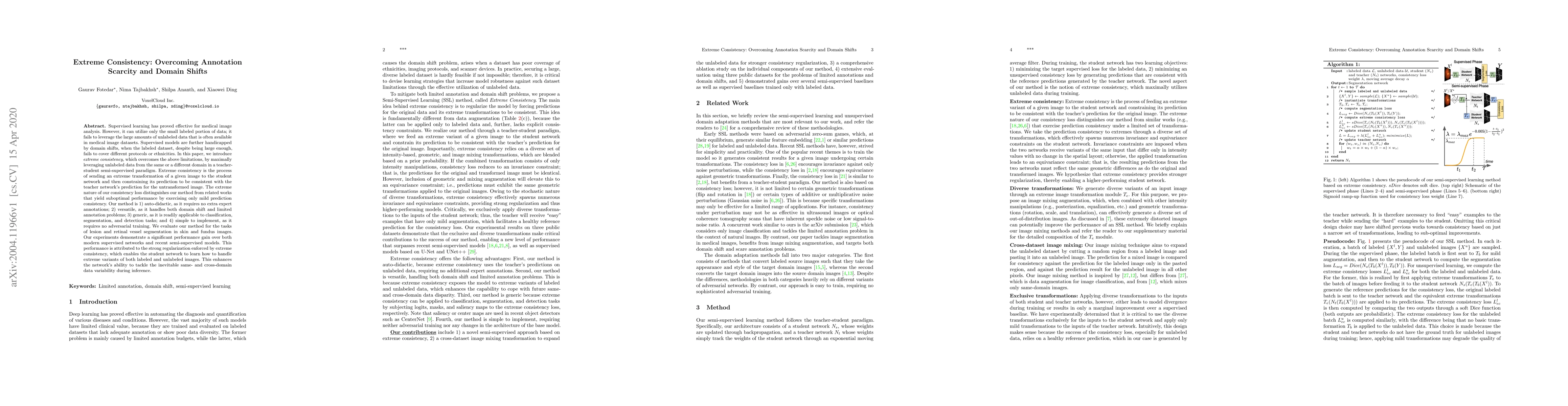 Supervised learning has proved effective for medical image analysis. However, it can utilize only the small labeled portion of data; it fails to leverage the large amounts of unlabeled data that is often available in medical image datasets. Supervised models are further handicapped by domain shifts, when the labeled dataset, despite being large enough, fails to cover different protocols or ethnicities. In this paper, we introduce \emph{extreme consistency}, which overcomes the above limitations, by maximally leveraging unlabeled data from the same or a different domain in a teacher-student semi-supervised paradigm. Extreme consistency is the process of sending an extreme transformation of a given image to the student network and then constraining its prediction to be consistent with the teacher network's prediction for the untransformed image. The extreme nature of our consistency loss distinguishes our method from related works that yield suboptimal performance by exercising only mild prediction consistency. Our method is 1) auto-didactic, as it requires no extra expert annotations; 2) versatile, as it handles both domain shift and limited annotation problems; 3) generic, as it is readily applicable to classification, segmentation, and detection tasks; and 4) simple to implement, as it requires no adversarial training. We evaluate our method for the tasks of lesion and retinal vessel segmentation in skin and fundus images. Our experiments demonstrate a significant performance gain over both modern supervised networks and recent semi-supervised models. This performance is attributed to the strong regularization enforced by extreme consistency, which enables the student network to learn how to handle extreme variants of both labeled and unlabeled images. This enhances the network's ability to tackle the inevitable same- and cross-domain data variability during inference.