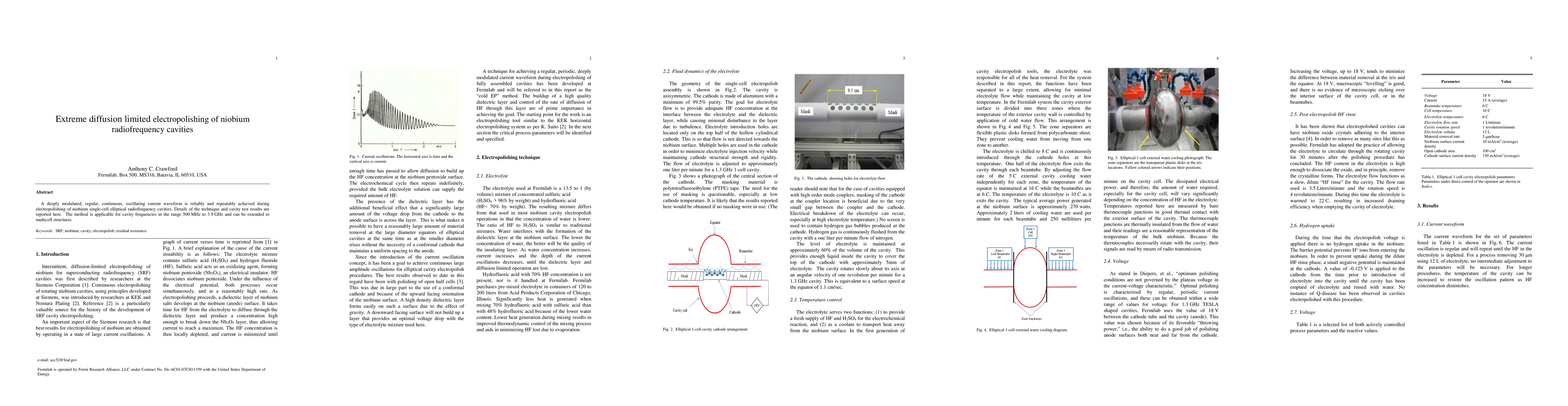 Summary: This paper describes a technique for achieving a modulated oscillating current during electropolishing of niobium radiofrequency cavities, leading to improved surface finish and repeatability. The method is effective for cavities operating in the frequency range of 500 MHz to 3.9 GHz and can be adapted for multicell structures.