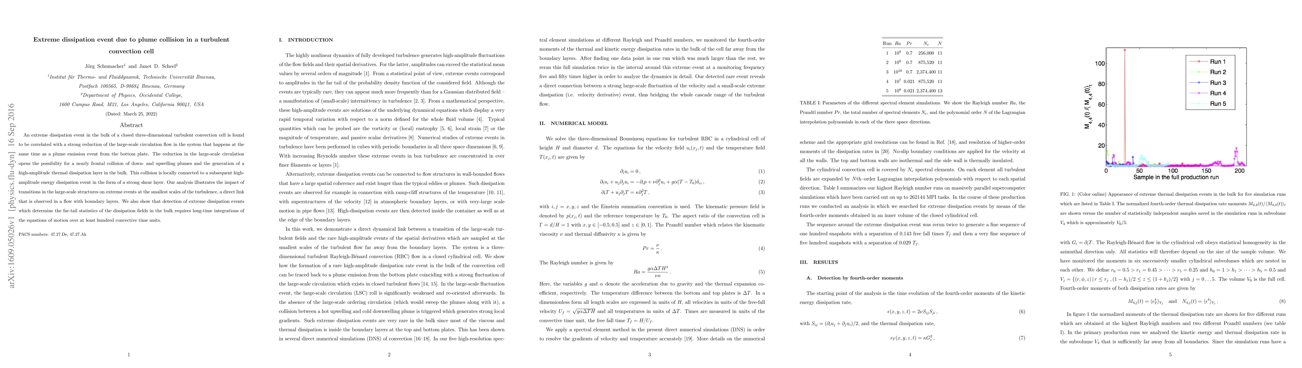 This study reveals that extreme dissipation events in turbulent convection are linked to plume collisions within the convection cell, leading to high-amplitude thermal dissipation layers. Long-time integrations are necessary to detect these events, which significantly influence the far-tail statistics of dissipation fields.