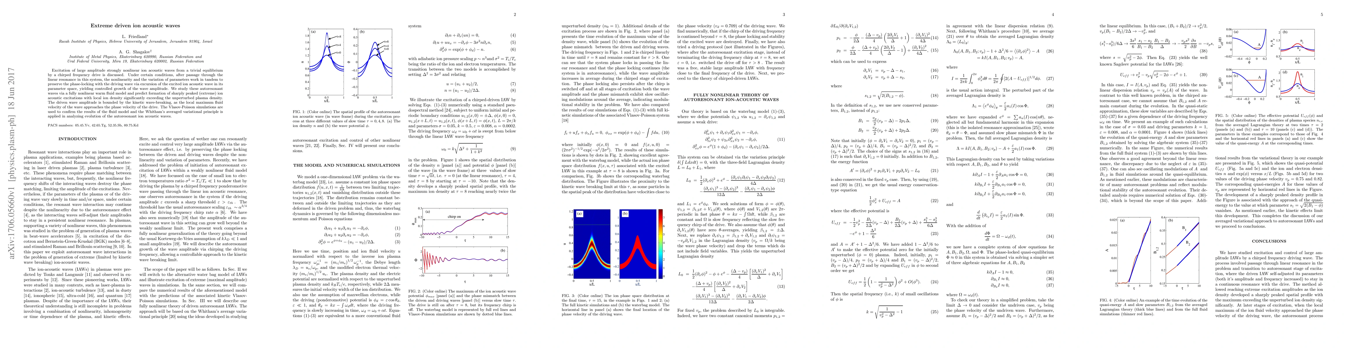 This paper investigates the excitation of large amplitude, nonlinear ion acoustic waves via a chirped frequency drive, revealing the formation of extreme, sharply peaked waves through a nonlinear warm fluid model. Simulations and the Whitham's averaged variational principle confirm these results, showing that wave amplitude is bounded by kinetic wave-breaking.