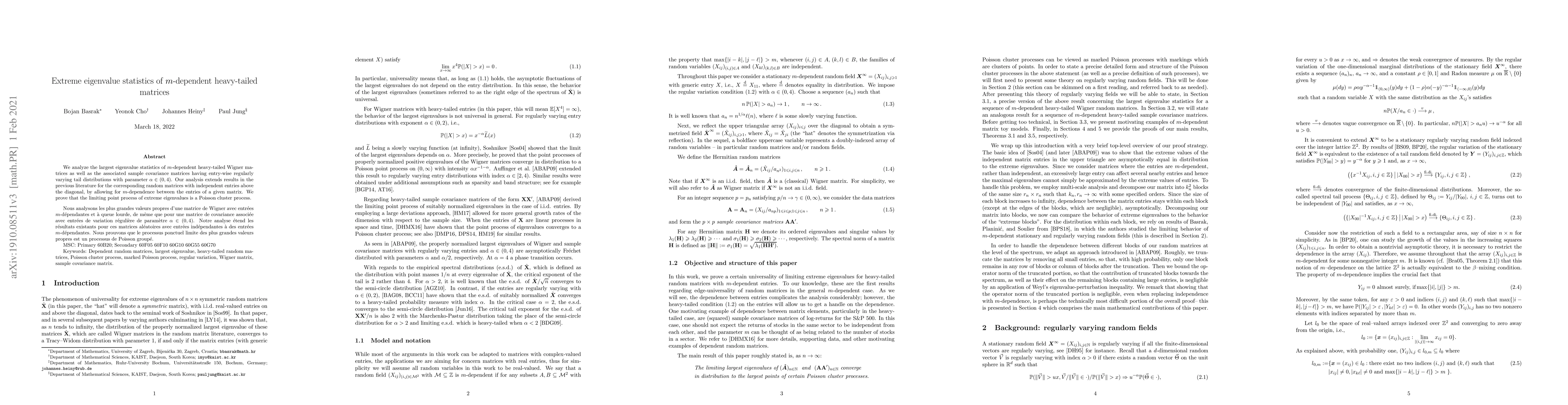 This paper investigates the eigenvalue statistics of $m$-dependent heavy-tailed Wigner matrices and their associated sample covariance matrices, demonstrating that the limiting distribution of extreme eigenvalues follows a Poisson cluster process, extending prior results for independent entries.