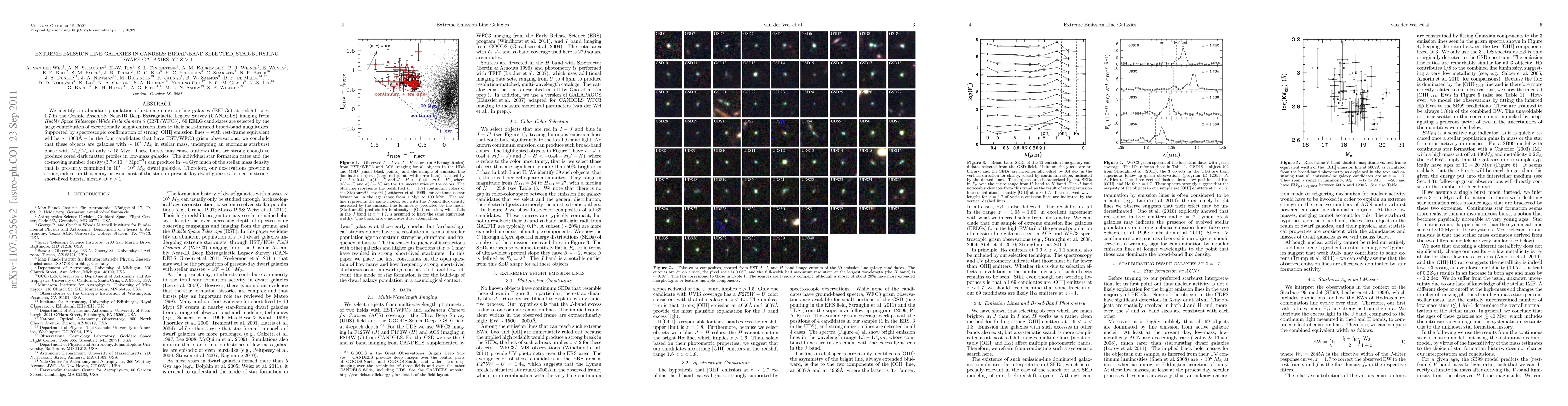 This paper identifies a population of extreme emission line galaxies (EELGs) at redshift z~1.7 in the CANDELS survey, characterized by exceptionally bright emission lines and undergoing intense starburst phases. These galaxies may have formed much of the current stellar mass in dwarf galaxies through short, powerful bursts of star formation at high redshifts.