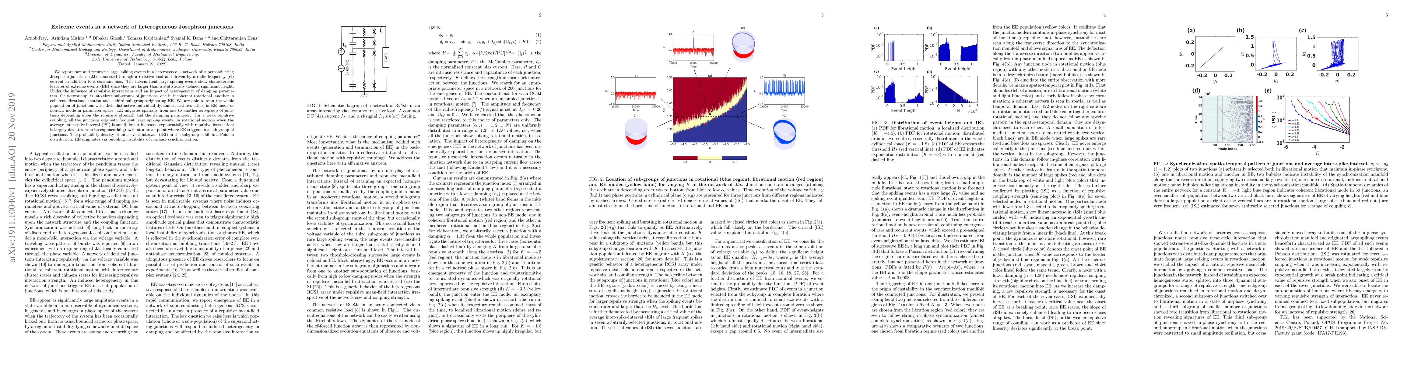 We report rare and recurrent large spiking events in a heterogeneous network of superconducting Josephson junctions (JJ) connected through a resistive load and driven by a radio-frequency (rf) current in addition to a constant bias. The intermittent large spiking events show characteristic features of extreme events (EE) since they are larger than a statistically defined significant height. Under the influence of repulsive interactions and an impact of heterogeneity of damping parameters, the network splits into three sub-groups of junctions, one in incoherent rotational, another in coherent librational motion and a third sub-group originating EE. We are able to scan the whole population of junctions with their distinctive individual dynamical features either in EE mode or non-EE mode in parameter space. EE migrates spatially from one to another sub-group of junctions depending upon the repulsive strength and the damping parameter. For a weak repulsive coupling, all the junctions originate frequent large spiking events, in rotational motion when the average inter-spike-interval (ISI) is small, but it increases exponentially with repulsive interaction; it largely deviates from its exponential growth at a break point where EE triggers in a sub-group of junctions. The probability density of inter-event-intervals (IEI) in the subgroup exhibits a Poisson distribution. EE originates via bubbling instability of in-phase synchronization.