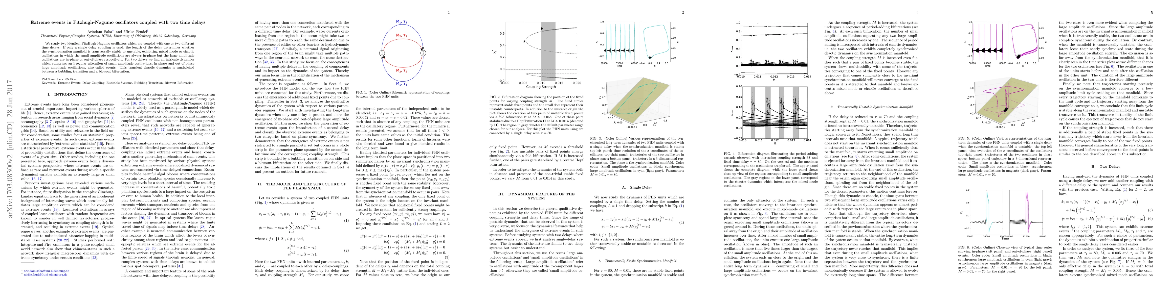 The paper presents a detailed analysis of the dynamics of coupled FitzHugh-Nagumo oscillators with two time delays, identifying conditions for extreme events and characterizing the underlying bifurcations.