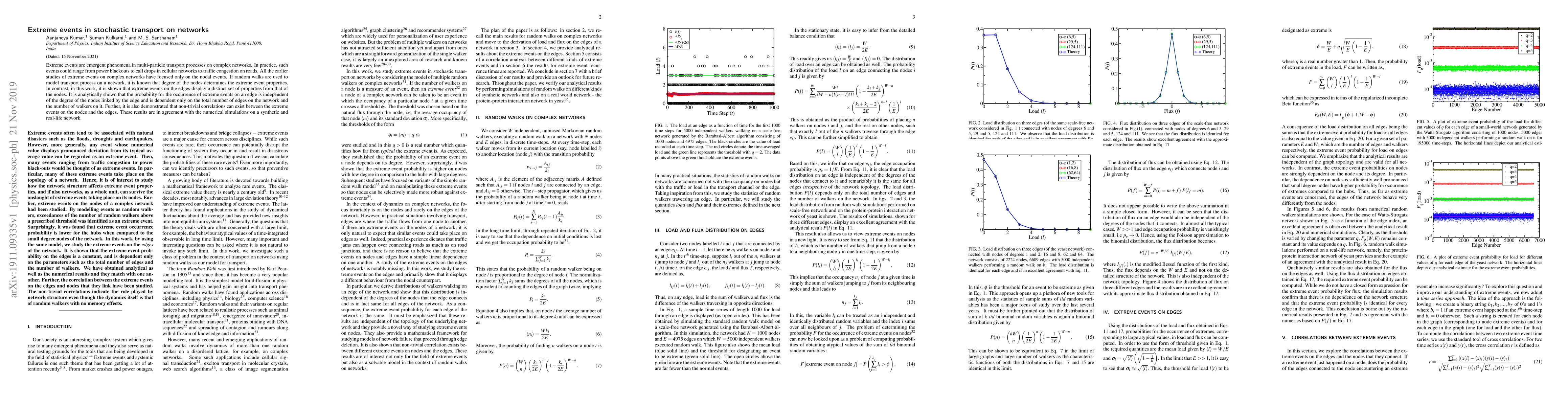This paper investigates extreme events in stochastic transport on networks, demonstrating that such events on edges exhibit distinct properties compared to those on nodes. It analytically shows that edge-based extreme events depend on the network's total edge count and walker number, rather than node degree, and highlights non-trivial correlations between node and edge events, validated by simulations on both synthetic and real networks.