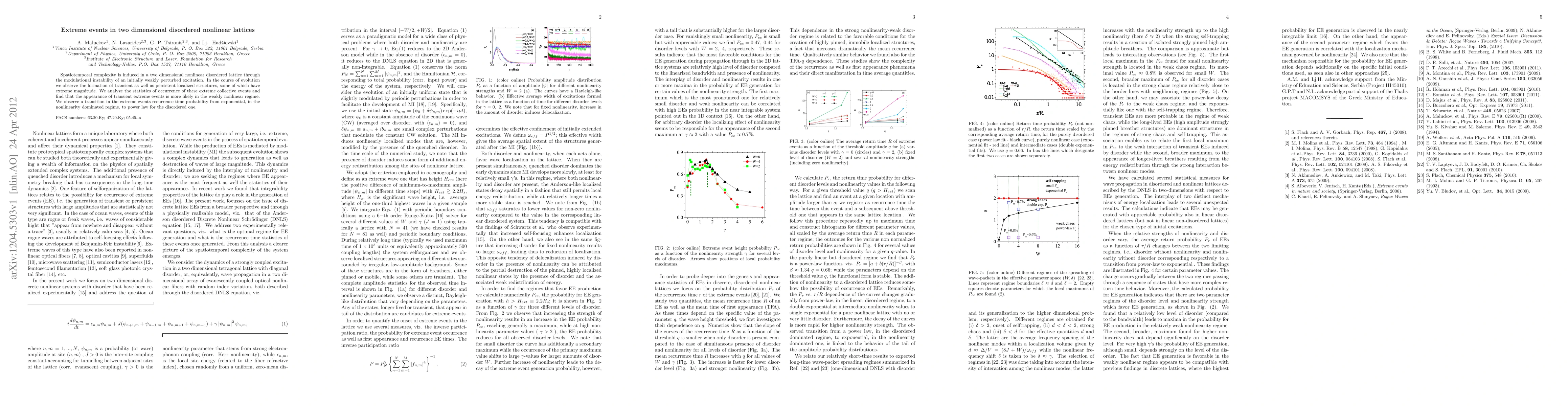 Spatiotemporal complexity is induced in a two dimensional nonlinear disordered lattice through the modulational instability of an initially weakly perturbed excitation. In the course of evolution we observe the formation of transient as well as persistent localized structures, some of which have extreme magnitude. We analyze the statistics of occurrence of these extreme collective events and find that the appearance of transient extreme events is more likely in the weakly nonlinear regime. We observe a transition in the extreme events recurrence time probability from exponential, in the nonlinearity dominated regime, to power law for the disordered one.