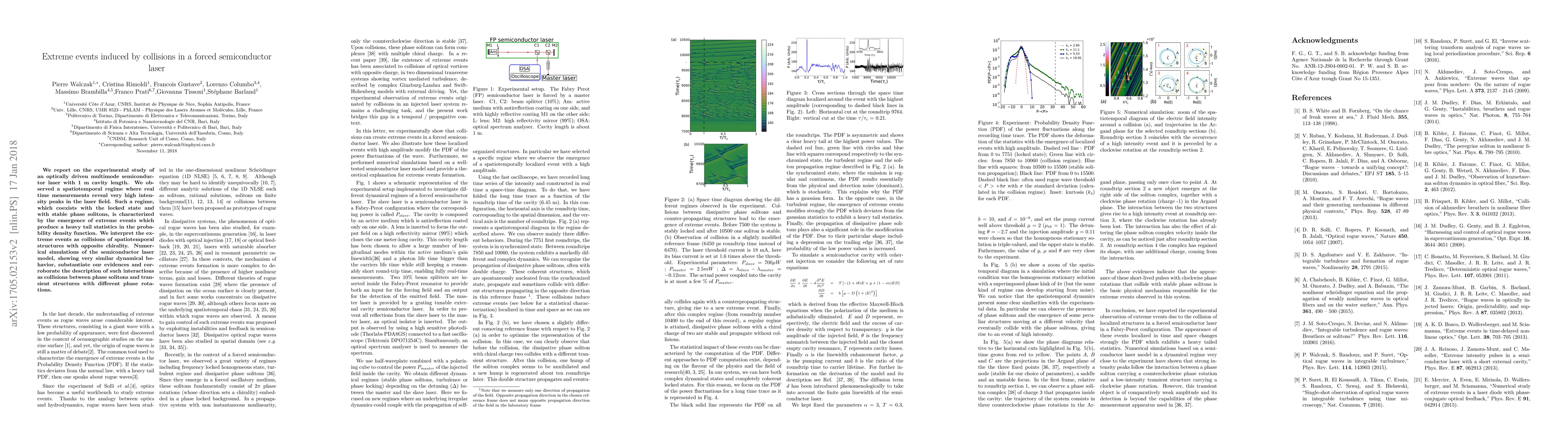 We report on the experimental study of an optically driven multimode semiconductor laser with 1~m cavity length. We observed a spatiotemporal regime where real time measurements reveal very high intensity peaks in the laser field. Such a regime, which coexists with the locked state and with stable phase solitons, is characterized by the emergence of extreme events which produce a heavy tail statistics in the probability density function. We interpret the extreme events as collisions of spatiotemporal structures with opposite chirality. Numerical simulations of the semiconductor laser model, showing very similar dynamical behavior, substantiate our evidences and corroborate the description of such interactions as collisions between phase solitons and transient structures with different phase rotations.