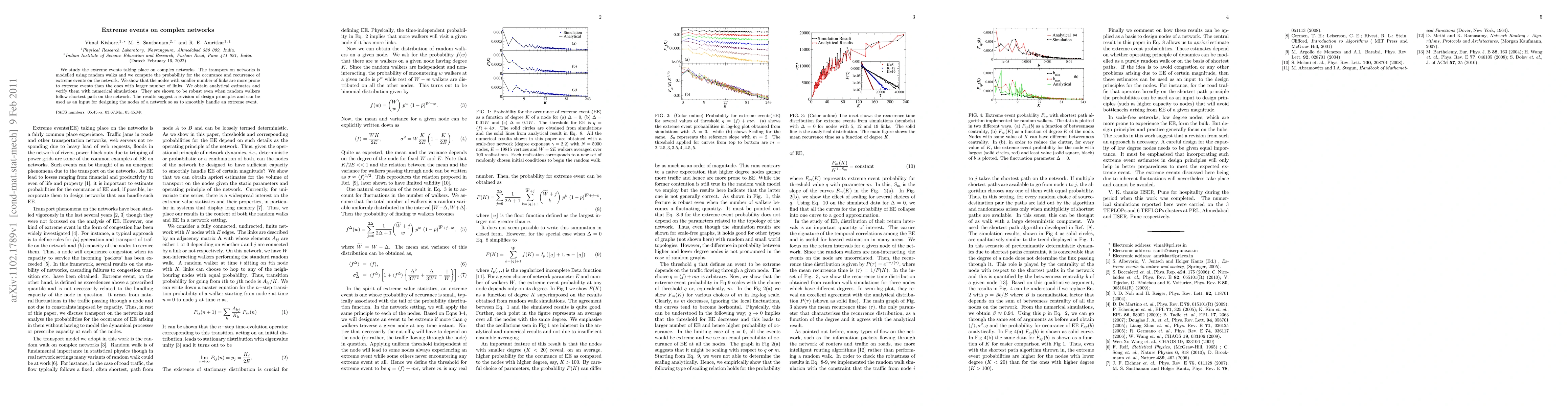 This paper investigates extreme events on complex networks using random walks, finding that nodes with fewer links are more susceptible to such events. Analytical estimates and numerical simulations confirm these insights, suggesting a need to revise design principles for network nodes to better manage extreme events.