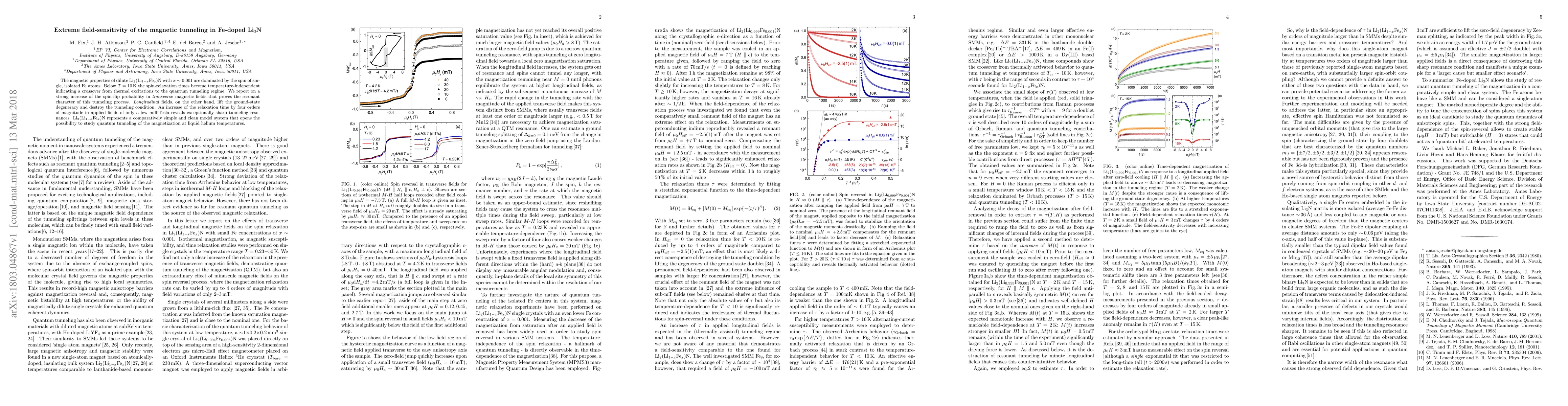 This paper investigates the magnetic tunneling in Fe-doped Li$_3$N, revealing a strong increase in spin-flip probability under transverse magnetic fields due to resonant quantum tunneling. Longitudinal fields disrupt this tunneling by lifting the ground-state degeneracy, showcasing an extreme field-sensitivity and a four-order-of-magnitude increase in relaxation time with small field changes.