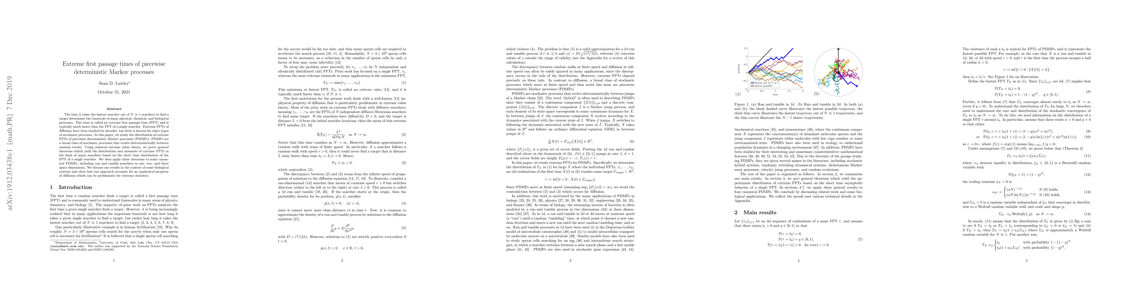 This paper investigates the extreme first passage times (FPTs) of piecewise deterministic Markov processes (PDMPs), which are stochastic processes with deterministic evolutions between random events. The authors use extreme value theory to derive the distribution and moments of extreme FPTs in scenarios with many searchers, applying these findings to biological systems and addressing an unphysical property of diffusion.