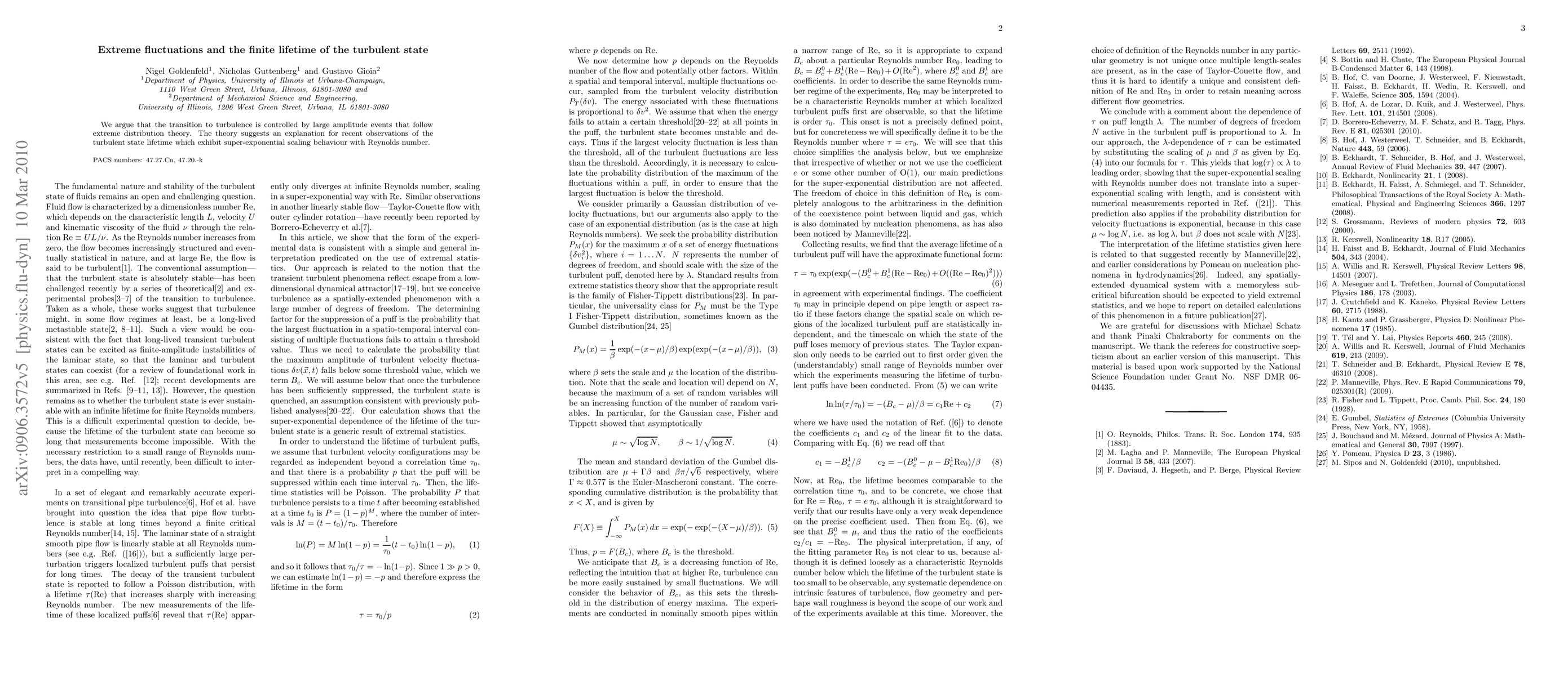 Researchers argue that turbulence is controlled by extreme events following an extreme distribution theory, leading to a finite lifetime of the turbulent state. This theory explains recent observations of turbulent state lifetimes showing super-exponential scaling behavior with Reynolds number.