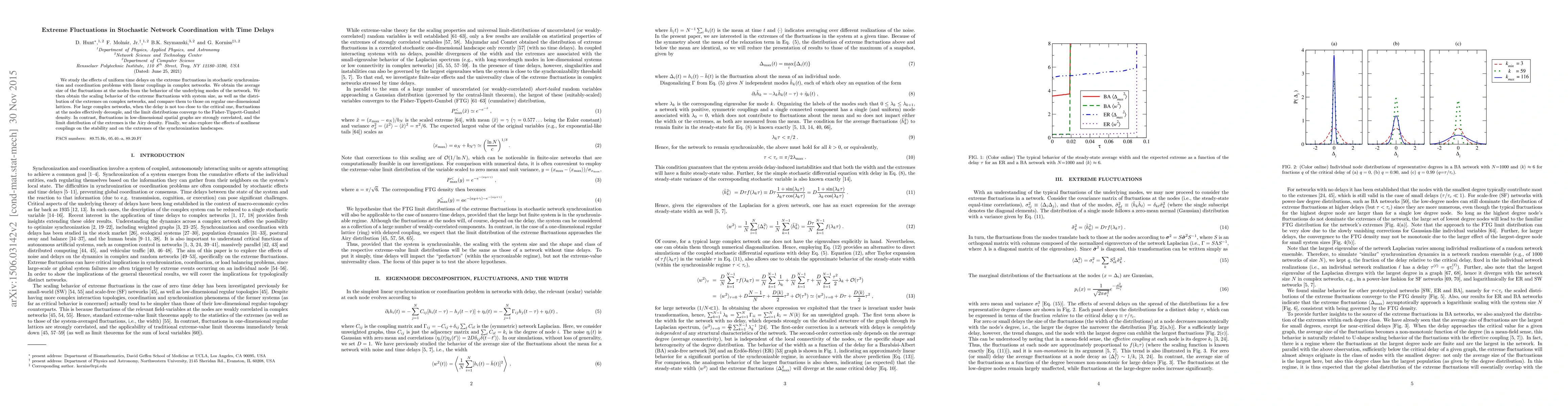 This paper investigates how time delays affect fluctuations in synchronization and coordination of complex networks with linear couplings, finding that large networks exhibit limit distributions similar to the Fisher-Tippett-Gumbel density, while low-dimensional graphs have limit distributions like the Airy density.