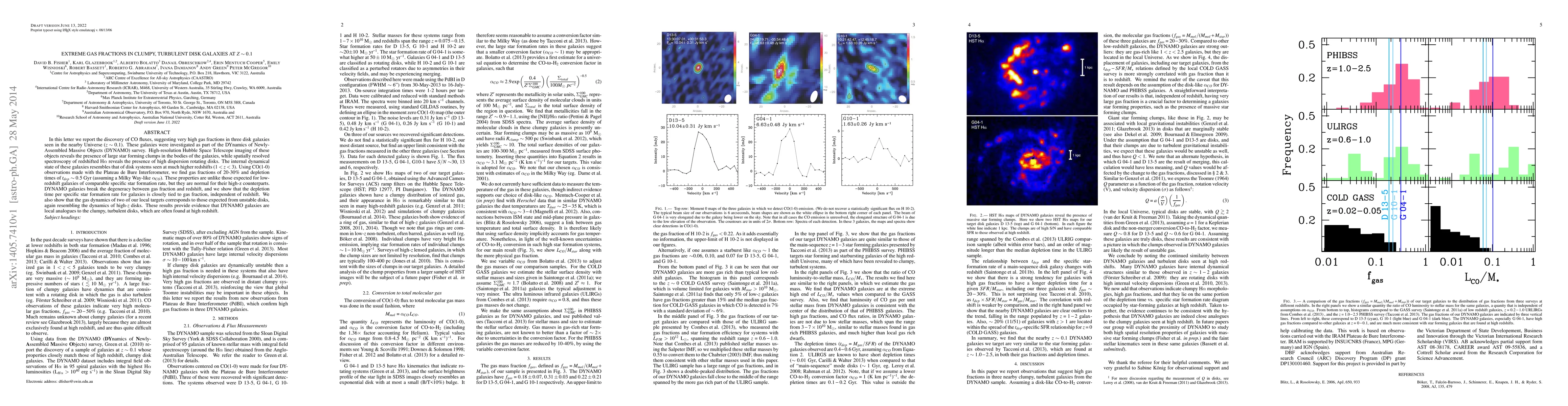Researchers discovered high gas fractions in disk galaxies at z=0.1, challenging expectations for low-redshift galaxies with similar star formation rates, and supporting the idea that these galaxies are local analogues to high-z clumpy disks.