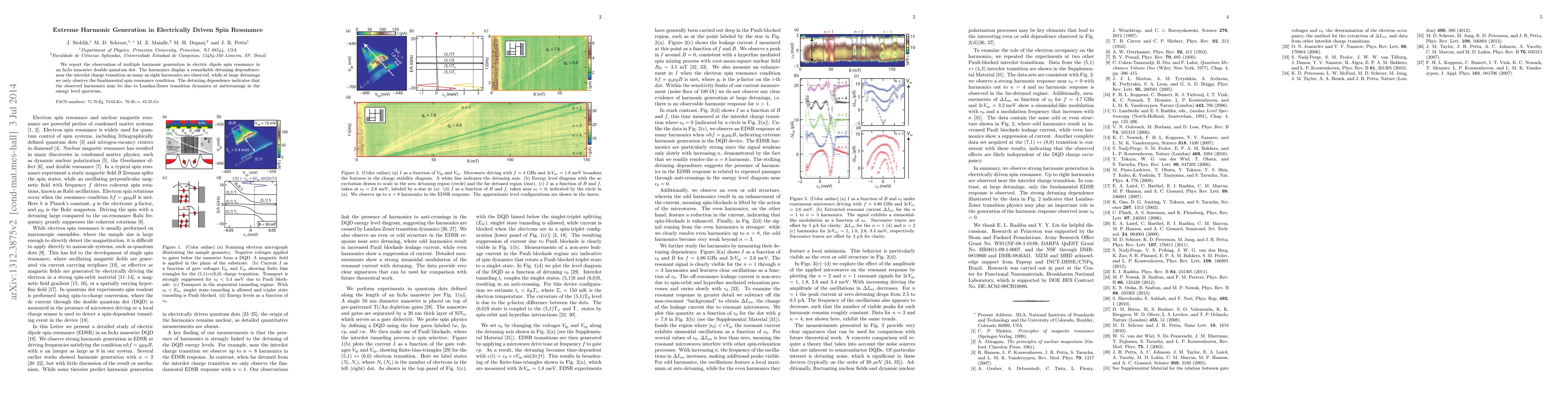 We report the observation of multiple harmonic generation in electric dipole spin resonance in an InAs nanowire double quantum dot. The harmonics display a remarkable detuning dependence: near the interdot charge transition as many as eight harmonics are observed, while at large detunings we only observe the fundamental spin resonance condition. The detuning dependence indicates that the observed harmonics may be due to Landau-Zener transition dynamics at anticrossings in the energy level spectrum.