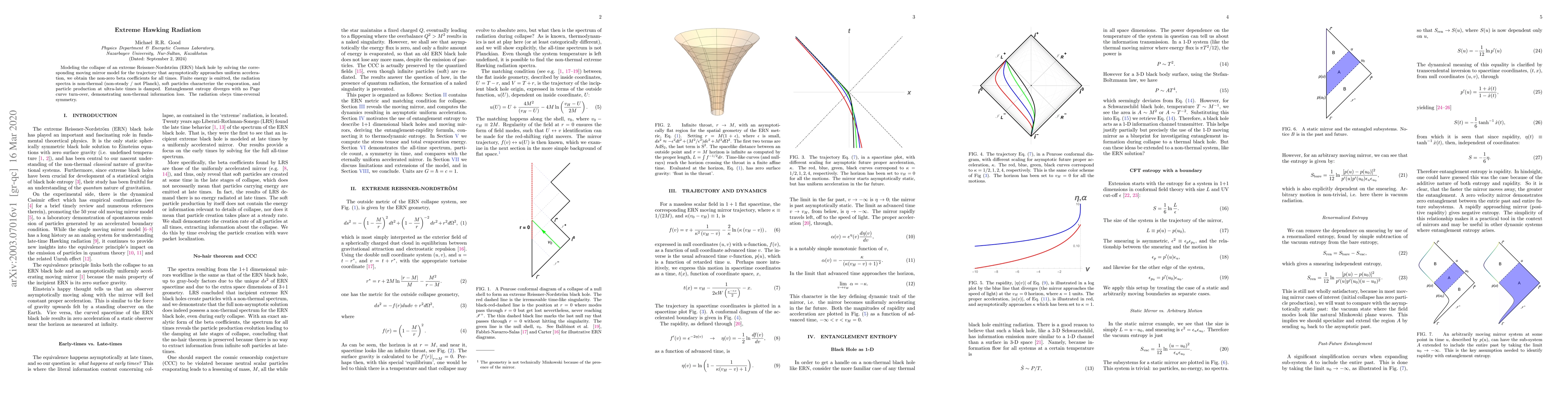 Modeling the collapse of an extreme Reissner-Nordstr\"om (ERN) black hole by solving the corresponding moving mirror model for the trajectory that asymptotically approaches uniform acceleration, we obtain the non-zero beta coefficients for all times. Finite energy is emitted, the radiation spectra is non-thermal (non-steady / not Planck), soft particles characterize the evaporation, and particle production at ultra-late times is damped. Entanglement entropy diverges with no Page curve turn-over, demonstrating non-thermal information loss. The radiation obeys time-reversal symmetry.
