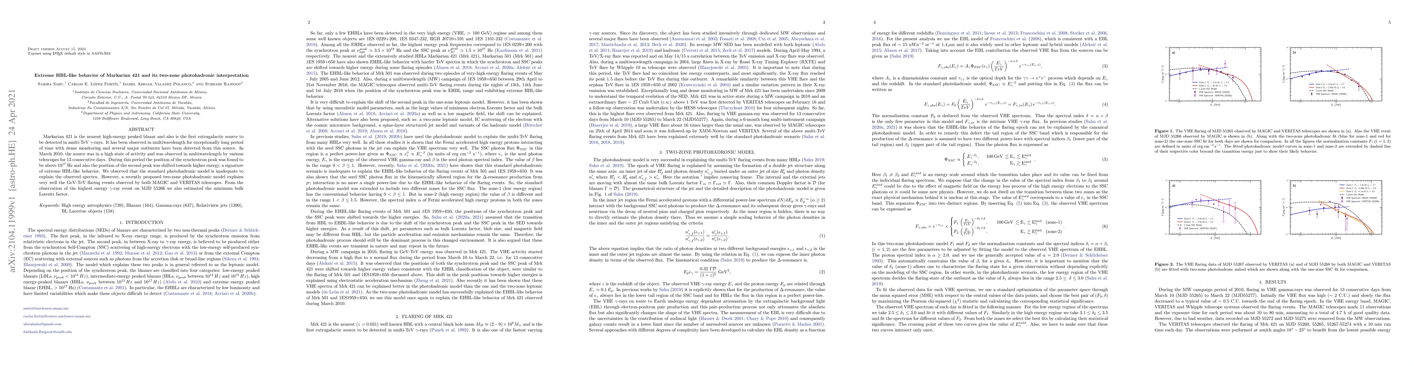 Markarian 421 is the nearest high-energy peaked blazar and also is the first extragalactic source to be detected in multi-TeV $\gamma$-rays. It has been observed in multiwavelength for exceptionally long period of time with dense monitoring and several major outbursts have been detected from this source. In March 2010, the source was in a high state of activity and was observed in multiwavelength by various telescopes for 13 consecutive days. During this period the position of the synchrotron peak was found to be above $10^{17}$ Hz and also the position of the second peak was shifted towards higher energy, a signature of extreme HBL-like behavior. We observed that the standard photohadronic model is inadequate to explain the observed spectra. However, a recently proposed two-zone photohadronic model explains very well the GeV-TeV flaring events observed by both MAGIC and VERITAS telescopes. From the observation of the highest energy $\gamma$-ray event on MJD 55266 we also estimated the minimum bulk Lorentz factor.