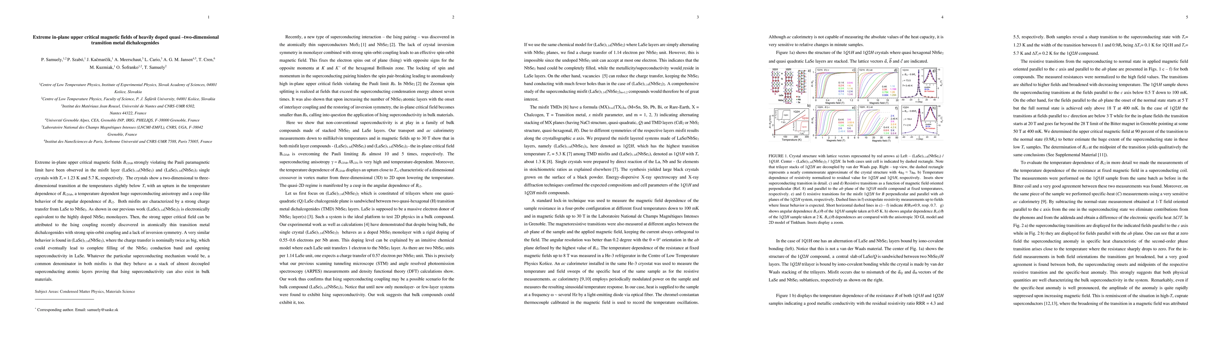 This research observes extreme in-plane upper critical magnetic fields in heavily doped quasi-two-dimensional transition metal dichalcogenides, attributing the strong fields to Ising coupling in materials with strong spin-orbit coupling. Both $(LaSe)_{1.14}(NbSe_2)$ and $(LaSe)_{1.14}(NbSe_2)_2$ exhibit superconducting behavior as stacks of nearly decoupled layers.