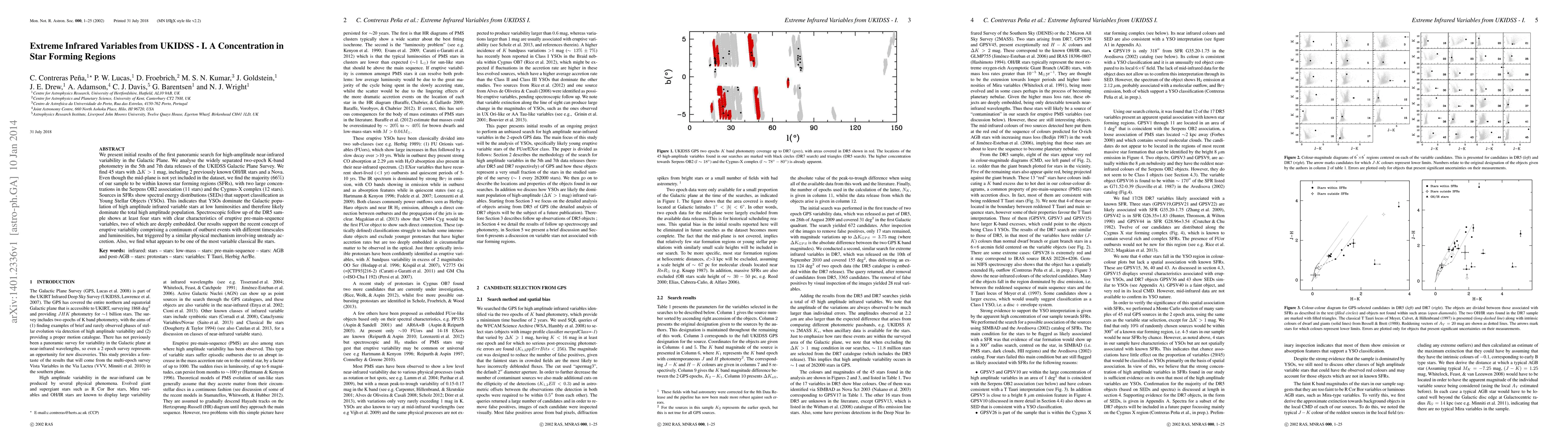 We present initial results of the first panoramic search for high-amplitude near-infrared variability in the Galactic Plane. We analyse the widely separated two-epoch K-band photometry in the 5th and 7th data releases of the UKIDSS Galactic Plane Survey. We find 45 stars with \Delta K > 1 mag, including 2 previously known OH/IR stars and a Nova. Even though the mid-plane is not yet included in the dataset, we find the majority (66%) of our sample to be within known star forming regions (SFRs), with two large concentrations in the Serpens OB2 association (11 stars) and the Cygnus-X complex (12 stars). Sources in SFRs show spectral energy distributions (SEDs) that support classification as Young Stellar Objects (YSOs). This indicates that YSOs dominate the Galactic population of high amplitude infrared variable stars at low luminosities and therefore likely dominate the total high amplitude population. Spectroscopic follow up of the DR5 sample shows at least four stars with clear characteristics of eruptive pre-main-sequence variables, two of which are deeply embedded. Our results support the recent concept of eruptive variability comprising a continuum of outburst events with different timescales and luminosities, but triggered by a similar physical mechanism involving unsteady accretion. Also, we find what appears to be one of the most variable classical Be stars.