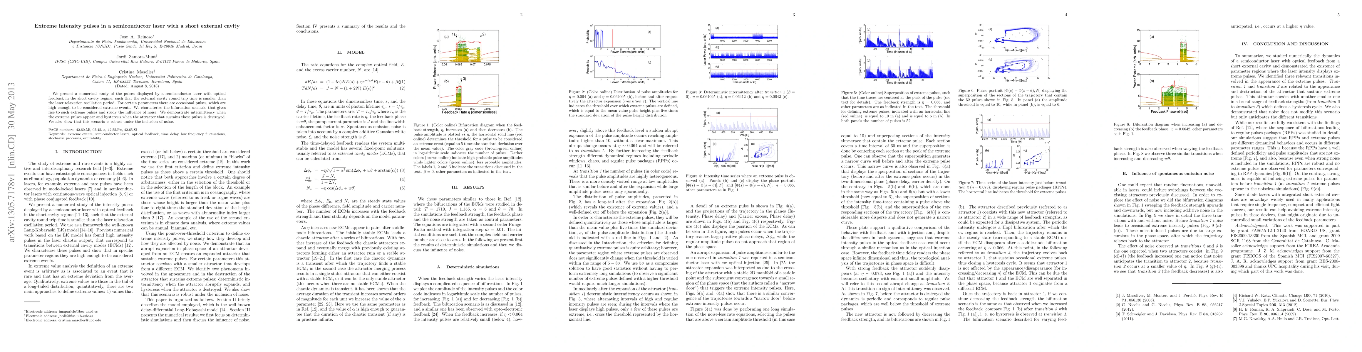 We present a numerical study of the pulses displayed by a semiconductor laser with optical feedback in the short cavity regime, such that the external cavity round trip time is smaller than the laser relaxation oscillation period. For certain parameters there are occasional pulses, which are high enough to be considered extreme events. We characterize the bifurcation scenario that gives rise to such extreme pulses and study the influence of noise. We demonstrate intermittency when the extreme pulses appear and hysteresis when the attractor that sustains these pulses is destroyed. We also show that this scenario is robust under the inclusion of noise.