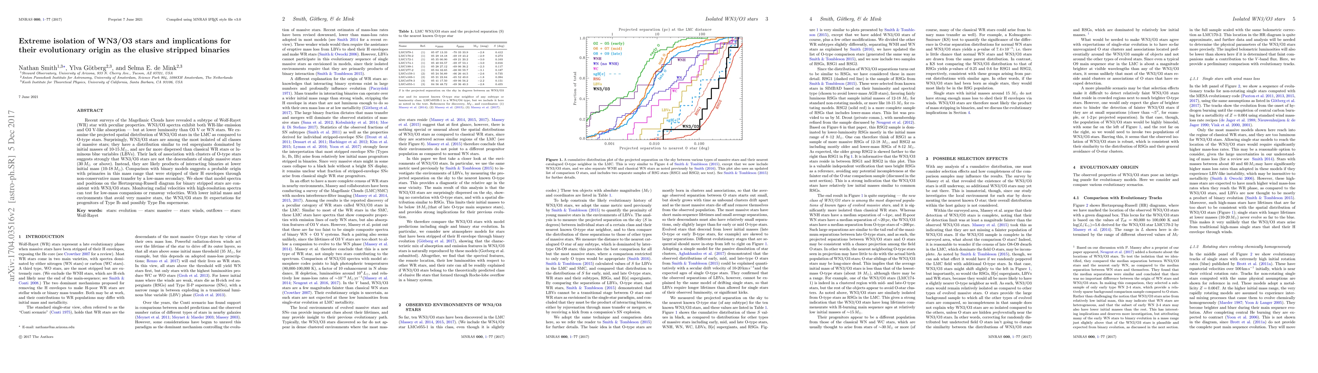 Recent surveys of the Magellanic Clouds have revealed a subtype of Wolf-Rayet (WR) star with peculiar properties. WN3/O3 spectra exhibit both WR-like emission and O3 V-like absorption - but at lower luminosity than O3 V or WN stars. We examine the projected spatial distribution of WN3/O3 stars in the LMC as compared to O-type stars. Surprisingly, WN3/O3 stars are among the most isolated of all classes of massive stars; they have a distribution similar to red supergiants dominated by initial masses of 10-15 $M_{\odot}$, and are far more dispersed than classical WR stars or luminous blue variables (LBVs). Their lack of association with clusters of O-type stars suggests strongly that WN3/O3 stars are not the descendants of single massive stars (30 $M_{\odot}$ or above). Instead, they are likely products of interacting binaries at lower initial mass (10-18 $M_{\odot}$). Comparison with binary models suggests a probable origin with primaries in this mass range that were stripped of their H envelopes through non-conservative mass transfer by a low-mass secondary. We show that model spectra and positions on the Hertzsprung-Russell diagram for binary stripped stars are consistent with WN3/O3 stars. Monitoring radial velocities with high-resolution spectra can test for low-mass companions or runaway velocities. With lower initial mass and environments that avoid very massive stars, the WN3/O3 stars fit expectations for progenitors of Type Ib and possibly Type Ibn supernovae.