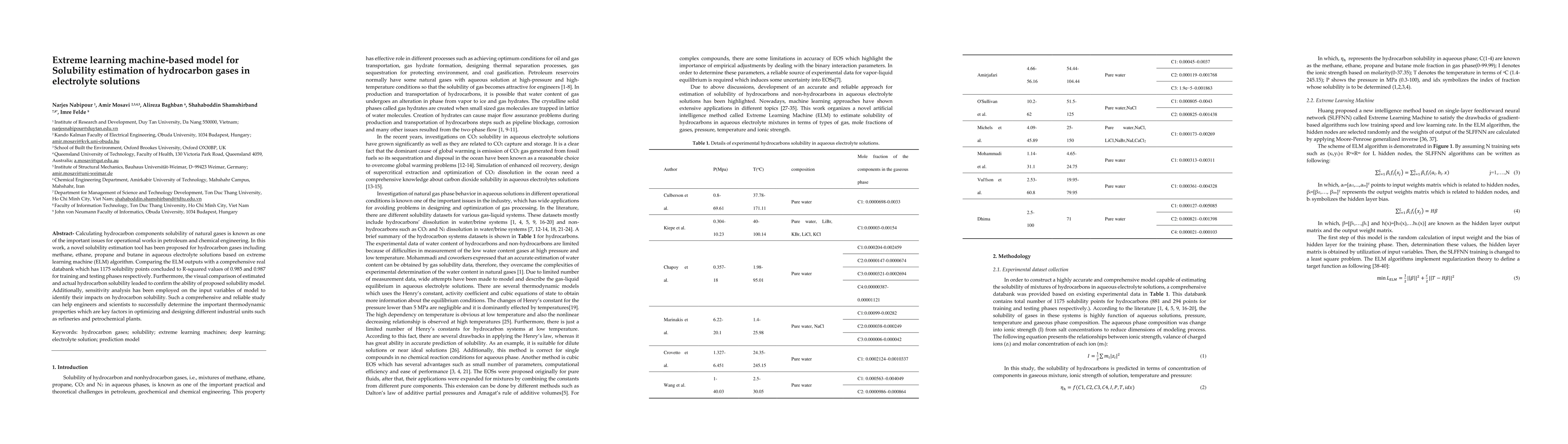 Calculating hydrocarbon components solubility of natural gases is known as one of the important issues for operational works in petroleum and chemical engineering. In this work, a novel solubility estimation tool has been proposed for hydrocarbon gases including methane, ethane, propane, and butane in aqueous electrolyte solutions based on extreme learning machine (ELM) algorithm. Comparing the ELM outputs with a comprehensive real databank which has 1175 solubility points concluded to R-squared values of 0.985 and 0.987 for training and testing phases respectively. Furthermore, the visual comparison of estimated and actual hydrocarbon solubility led to confirm the ability of the proposed solubility model. Additionally, sensitivity analysis has been employed on the input variables of the model to identify their impacts on hydrocarbon solubility. Such a comprehensive and reliable study can help engineers and scientists to successfully determine the important thermodynamic properties which are key factors in optimizing and designing different industrial units such as refineries and petrochemical plants.