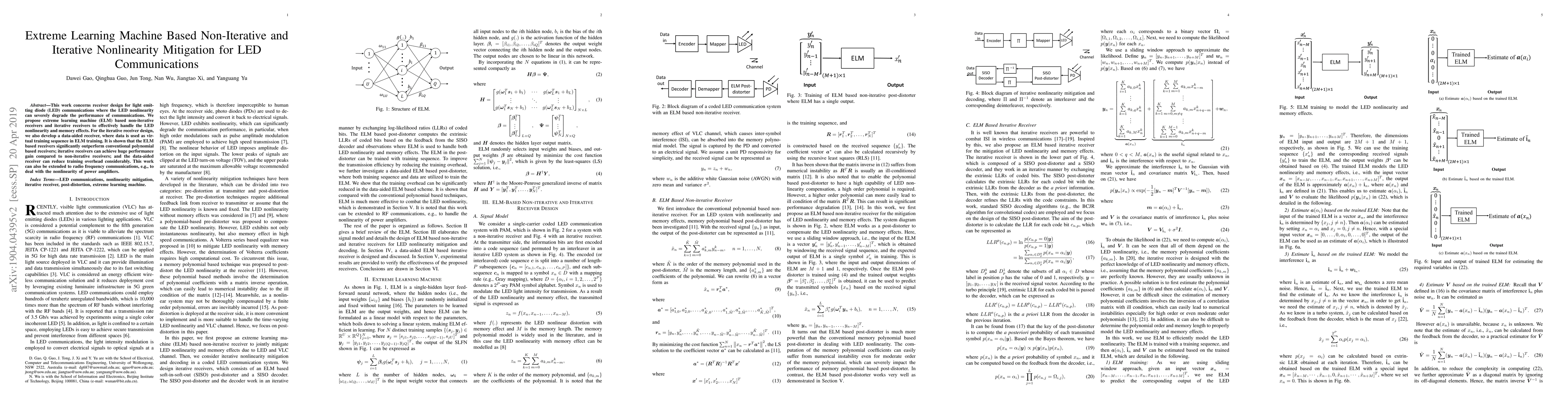 This paper proposes extreme learning machine (ELM) based non-iterative and iterative receivers to mitigate LED nonlinearity in communications, showing significant performance gains over conventional methods. The iterative, data-aided ELM receiver notably reduces training overhead.