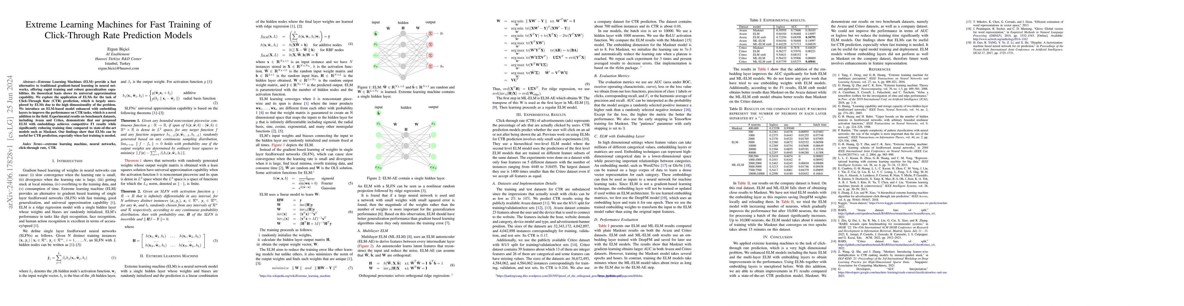 This paper proposes an Extreme Learning Machine (ELM) model enhanced with embedding layers for Click-Through Rate (CTR) prediction, demonstrating competitive F1 scores while significantly reducing training time compared to traditional gradient-based methods. Experimental results on benchmark datasets show ELMs' potential for fast and effective CTR prediction.