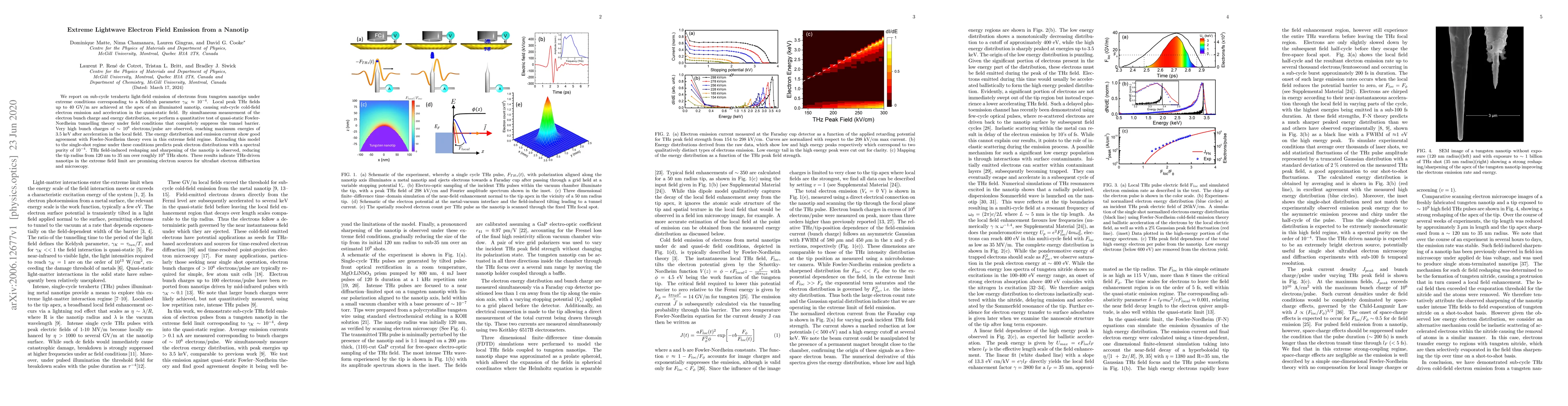 This paper investigates electron emission from tungsten nanotips under extreme terahertz fields, achieving peak THz fields of up to 40 GV/m. The study finds high electron bunch charges and energies of 3.5 keV, validating quasi-static Fowler-Nordheim theory even in extreme conditions, and suggests THz-driven nanotips as potential sources for ultrafast electron diffraction and microscopy.